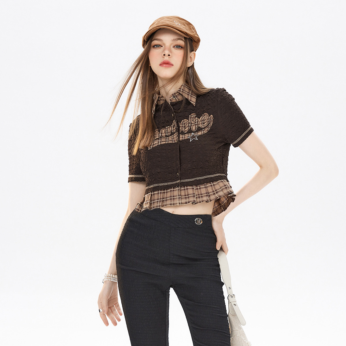 夏装复古拼接学院风辣妹衬衫女露脐字母绣花短上衣 677012