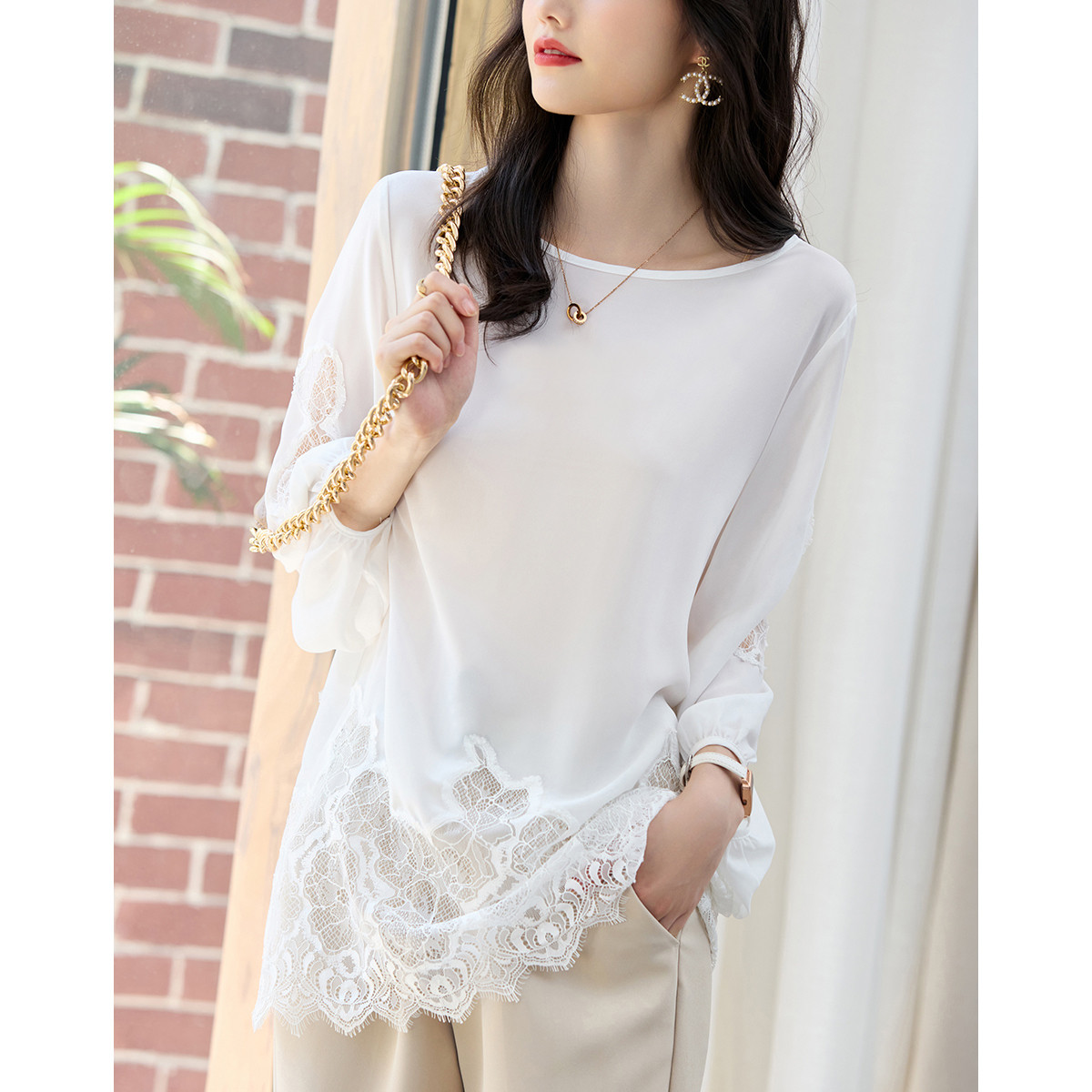 【蕾丝拼接】春秋新圆领七分袖宽松简约衬衫女春秋季上衣 685505