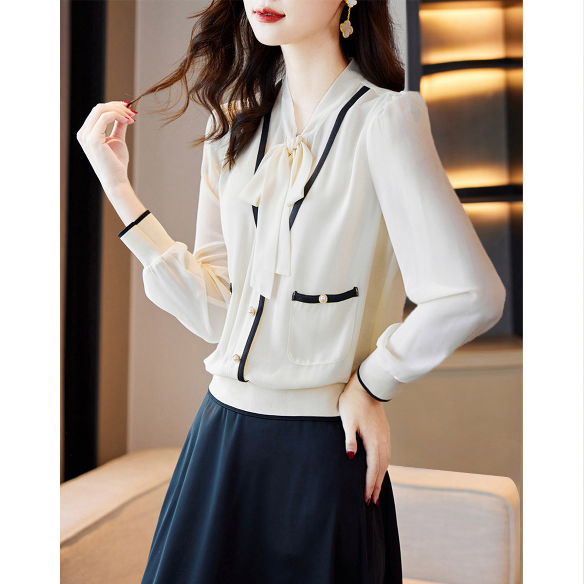 【珍珠雪纺衬衫】春秋系带领撞色织带衬衣女式上衣 482689