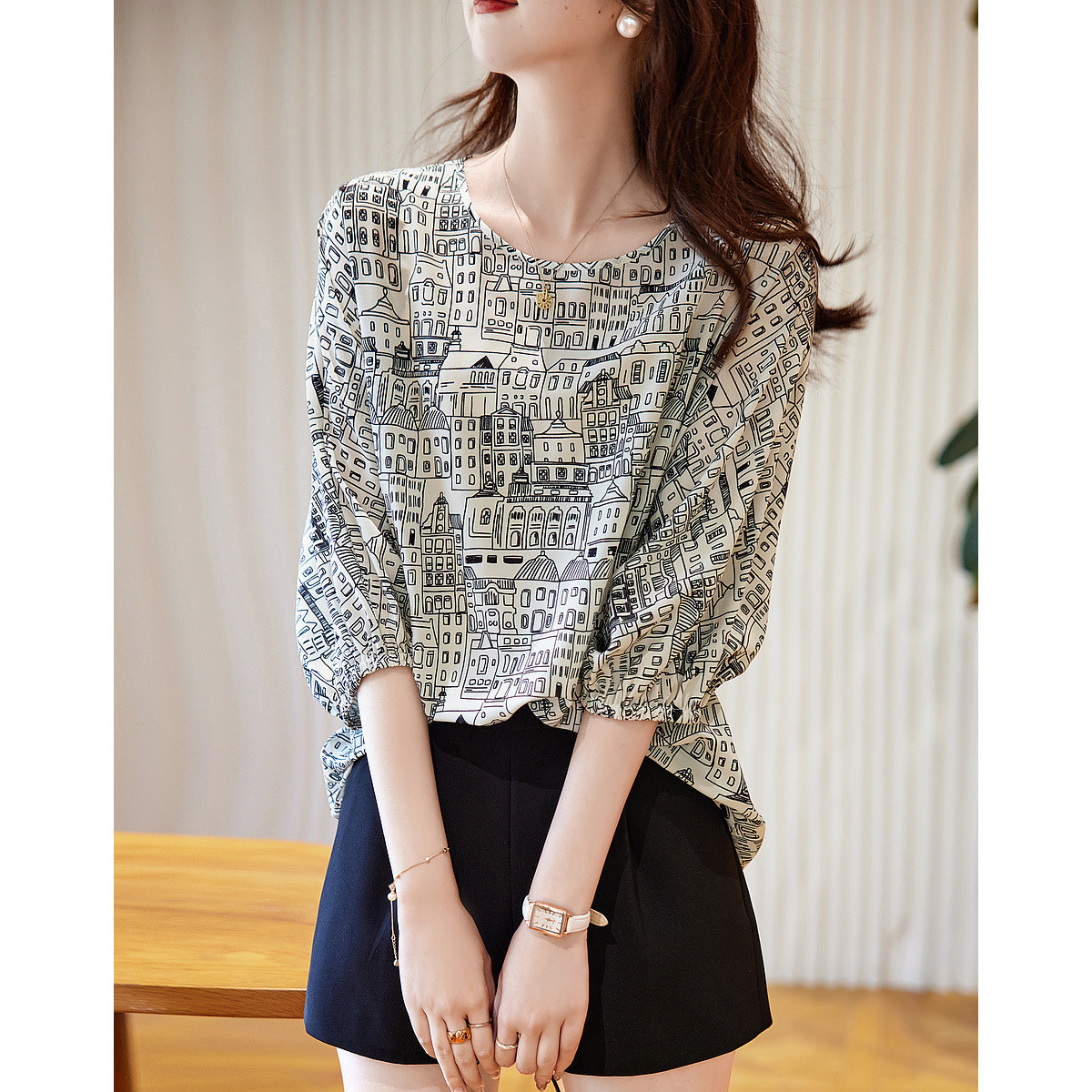 【漫游城市】夏设计感线条建筑印花衬衫舒滑复合丝花瑶衬衣女上衣 942017