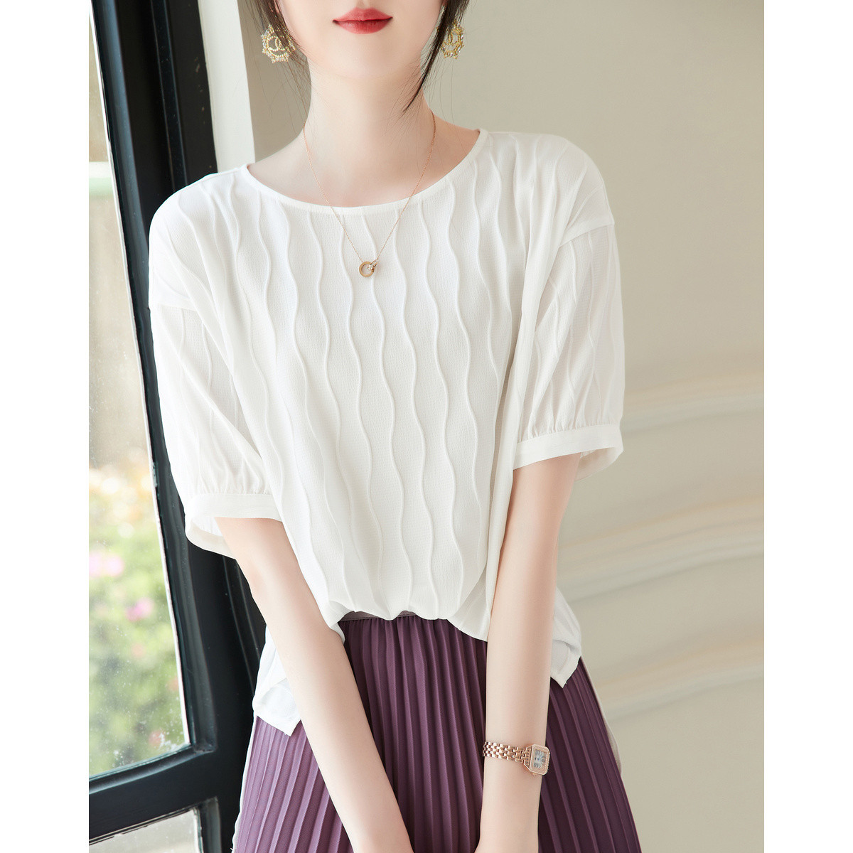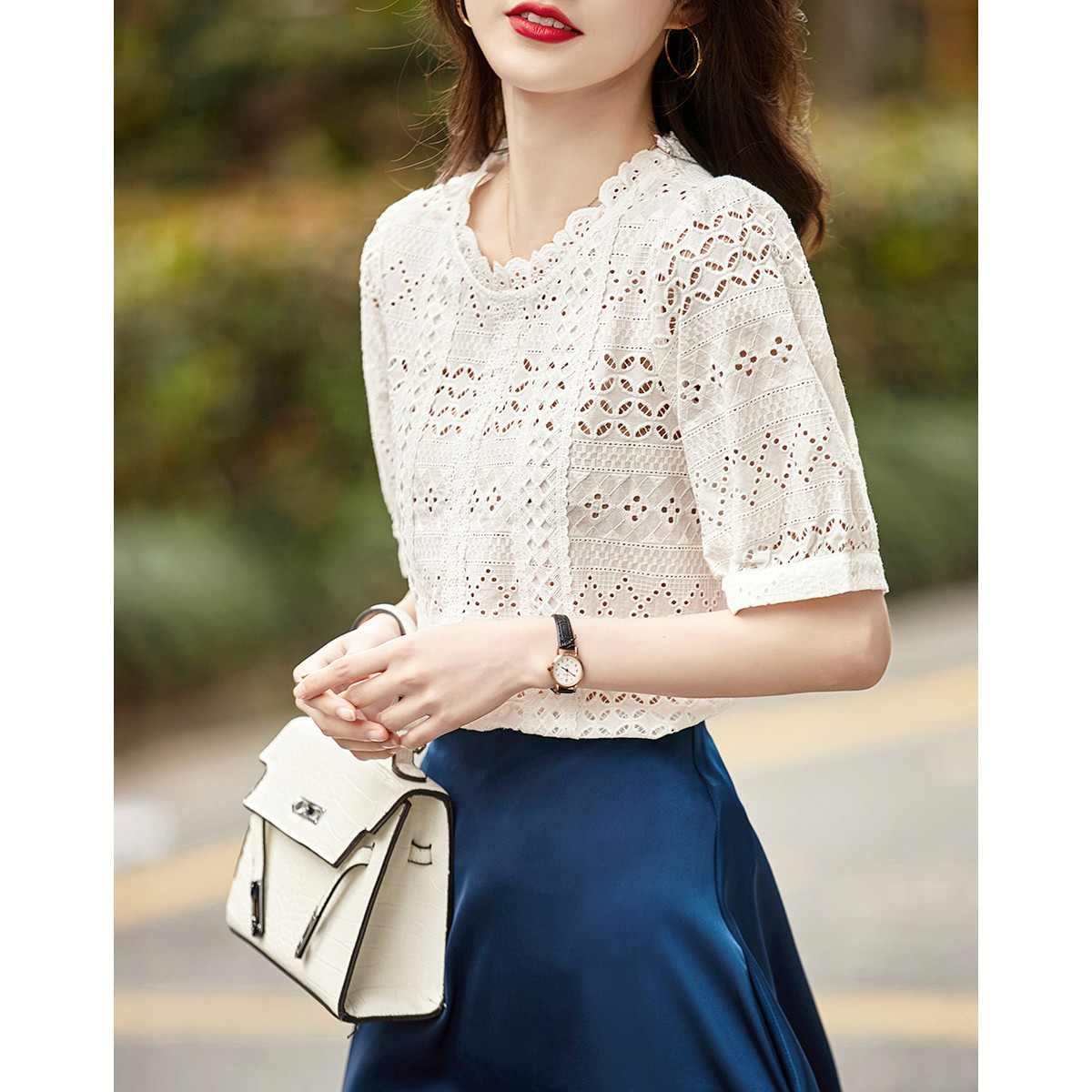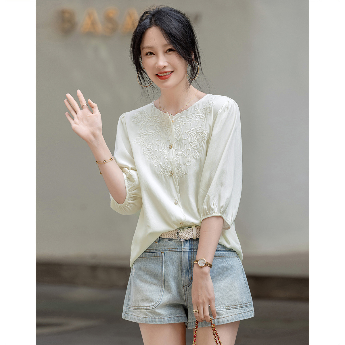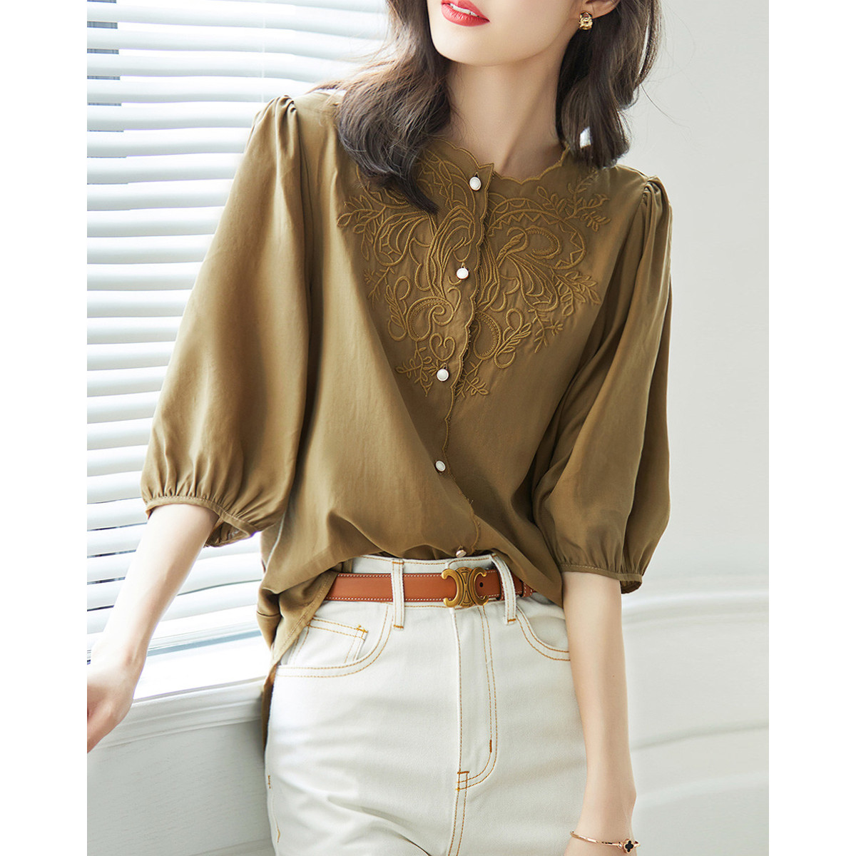 【棉布打孔绣花】夏圆领泡泡五分袖衬衣女式上衣 592641