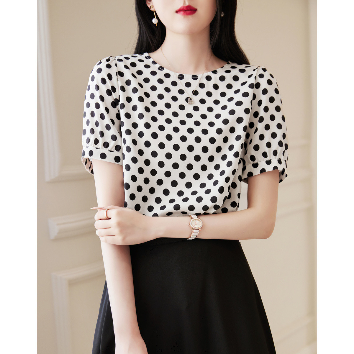 【波点衬衣】夏季圆领泡泡袖合体印花女装上衣衬衫女 964737