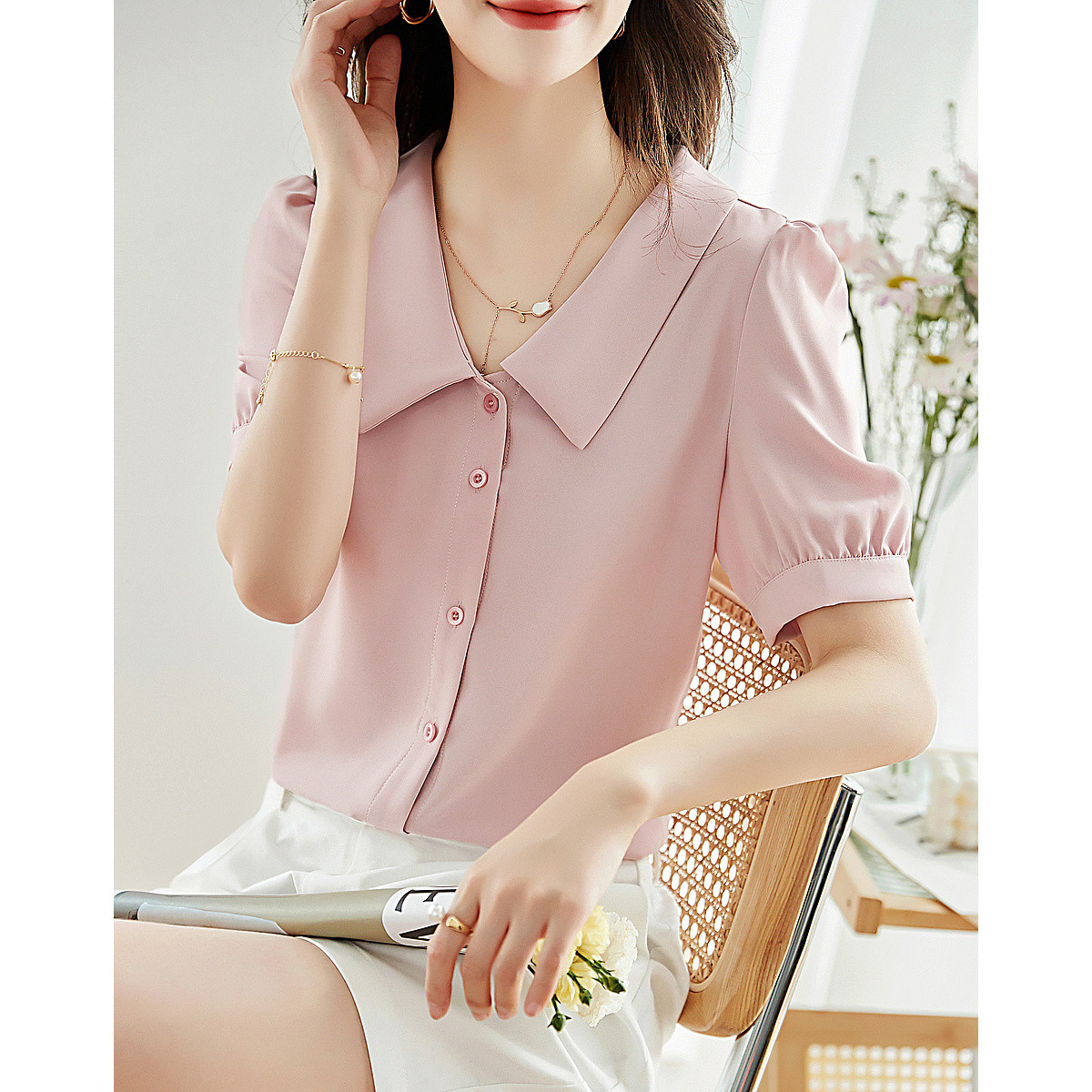 【时尚泡泡袖】夏泡泡袖设计翻领宽松女衬衫 202328