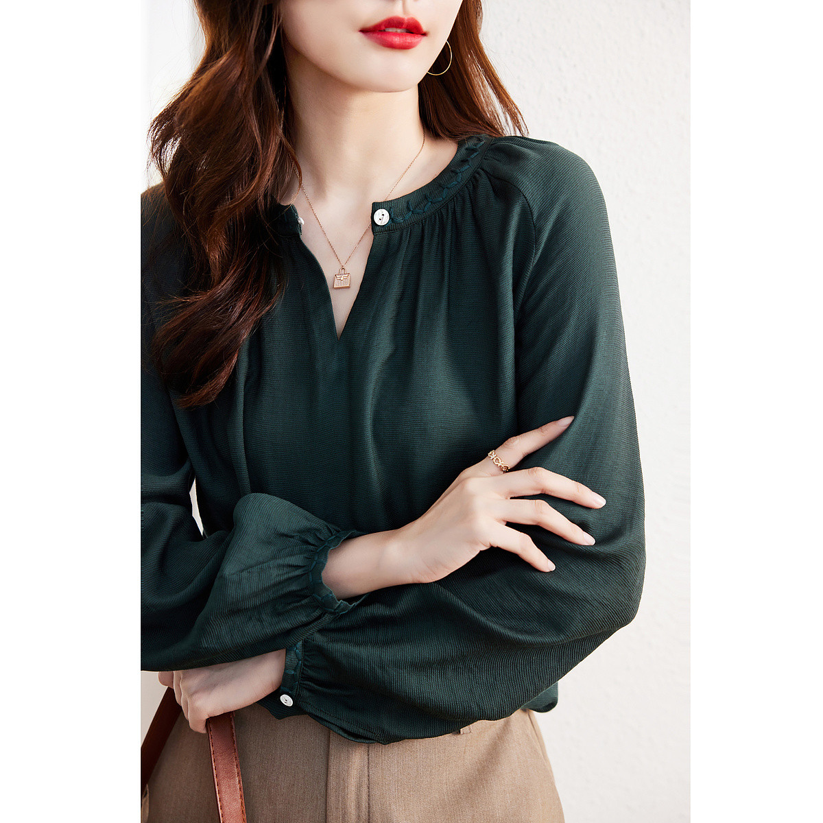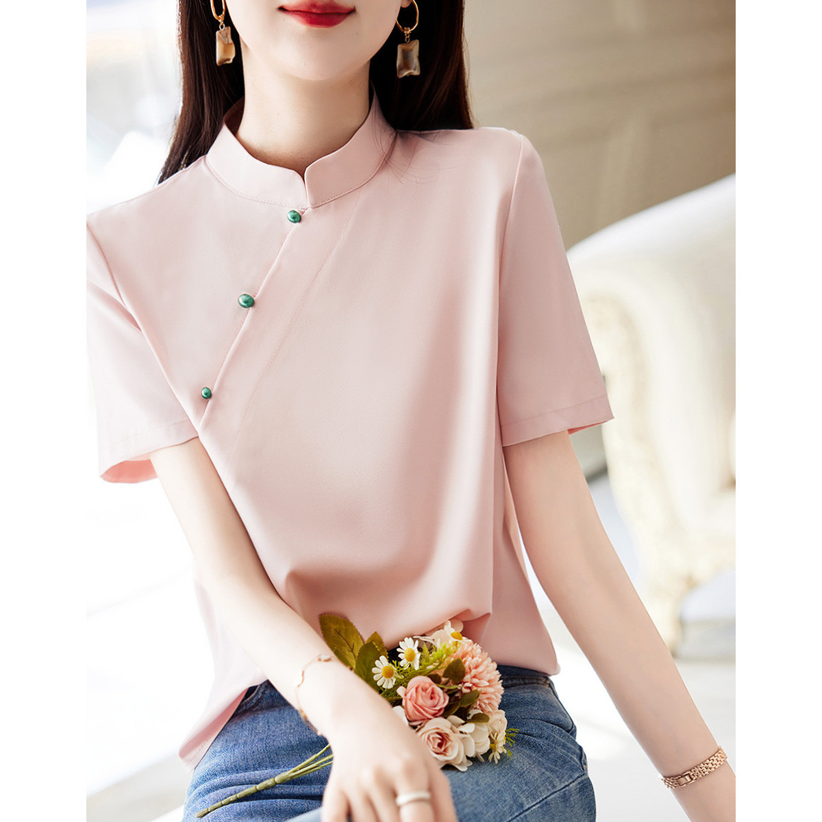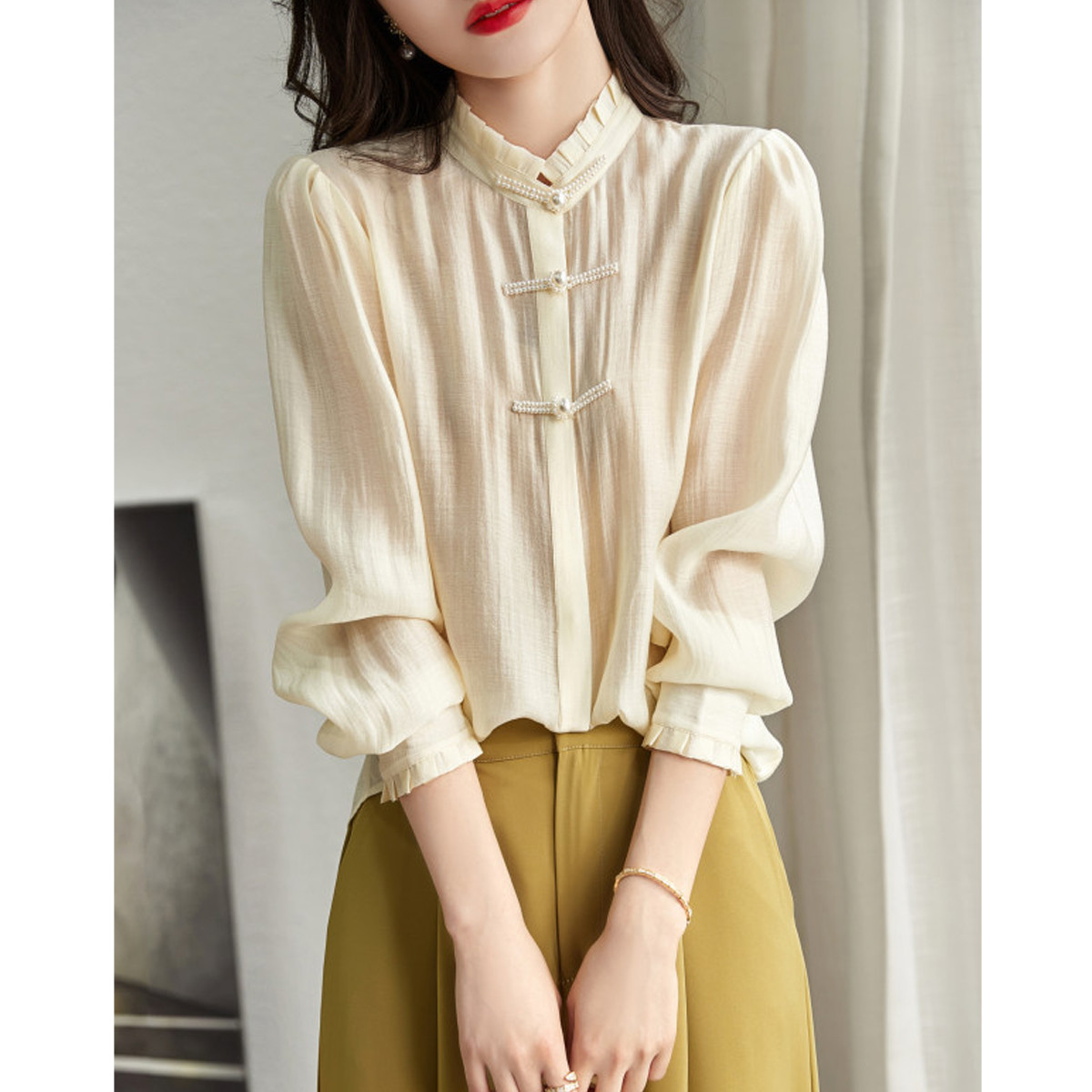 【仿天丝衬衫】秋款立领直筒珍珠盘扣长袖衬衣女装上衣 783745