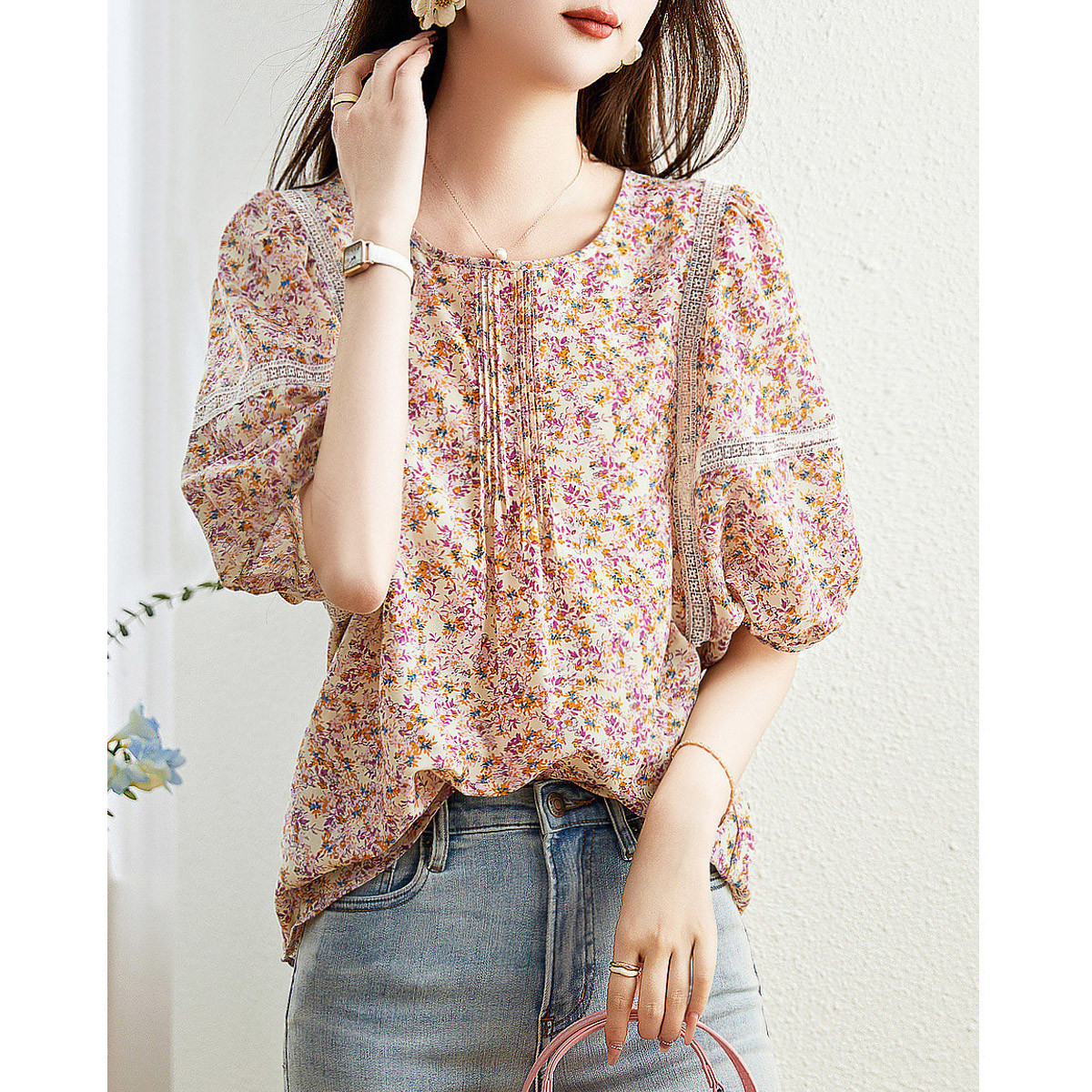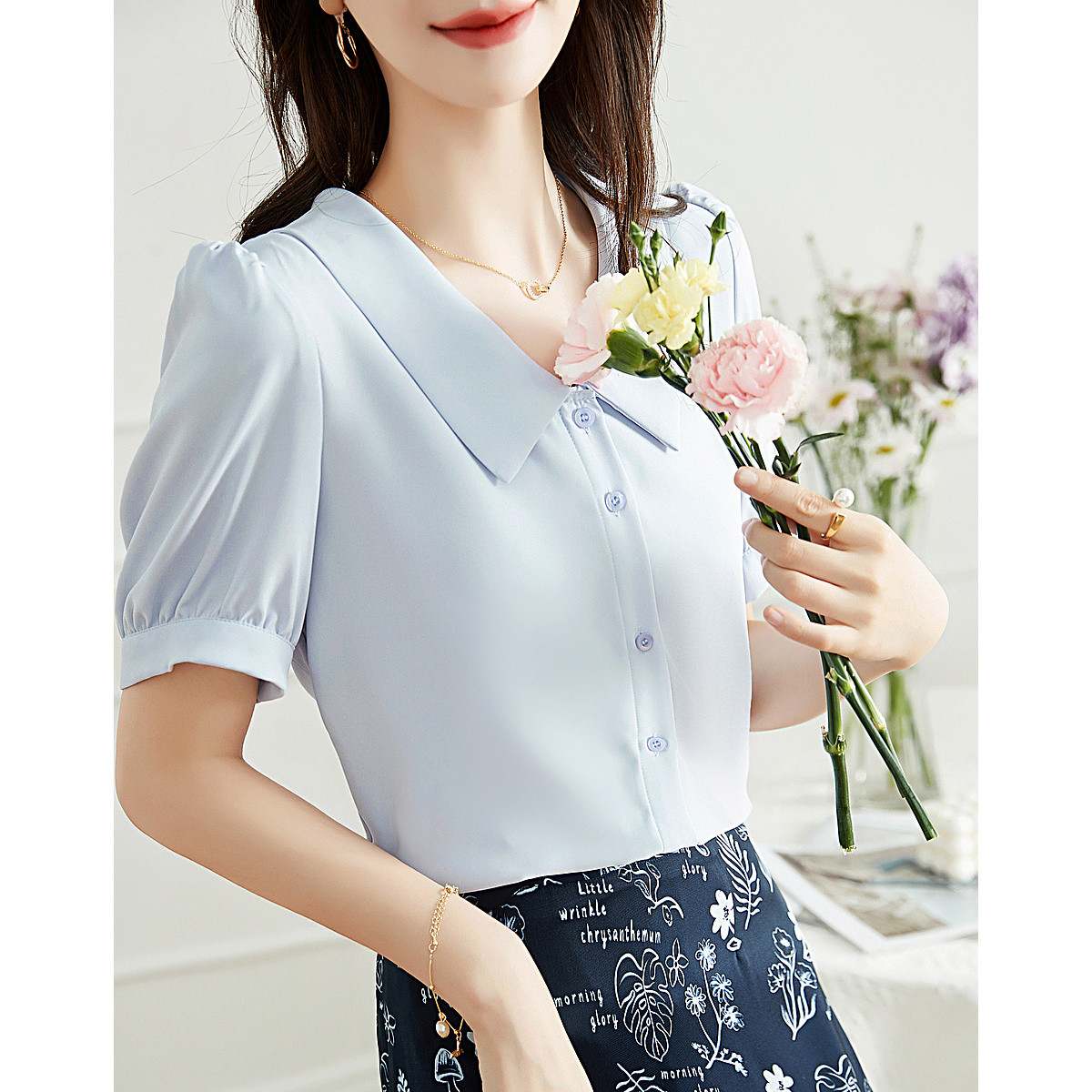【仿丝绵印花衬衫】春秋圆领泡泡袖花边织带衬衣女装上衣 695809