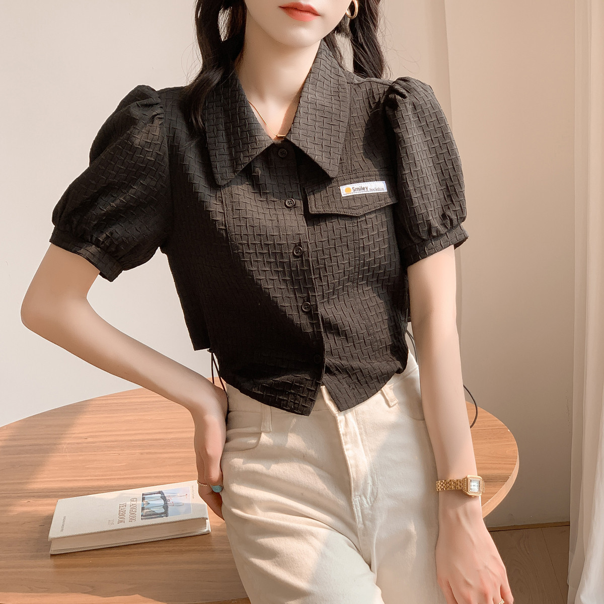 夏季时尚不规则抽绳翻领衬衣女设计感小众短袖褶皱泡泡袖短款衬衫 271320