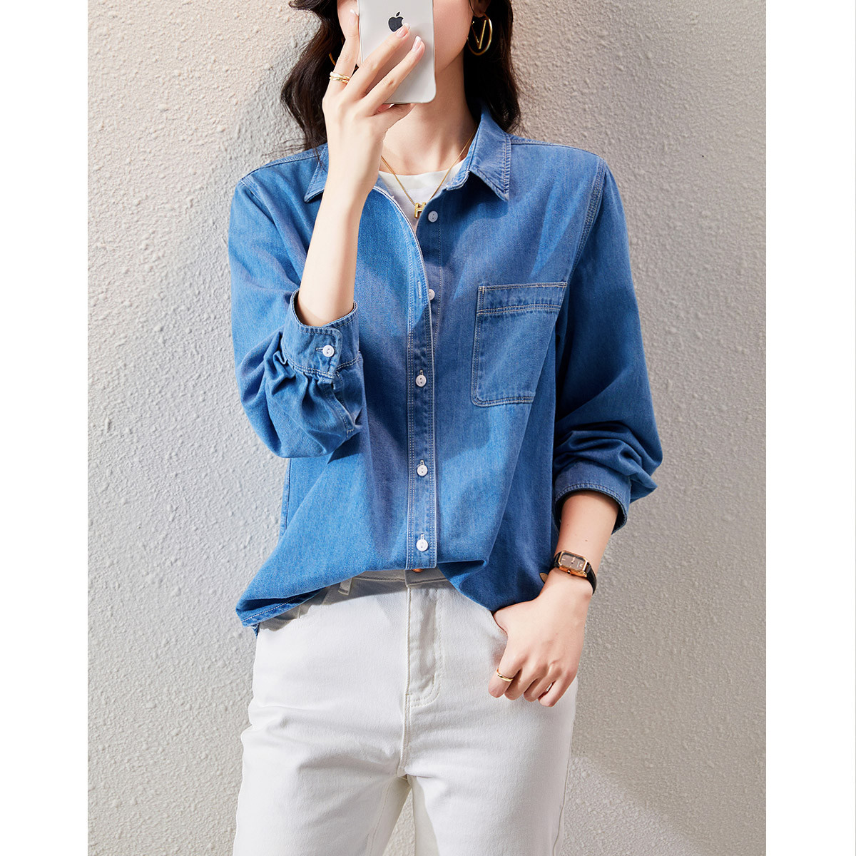 【简约牛仔衬衫】春款港风经典百搭休闲显瘦长款女式牛仔衬衫外套 808001