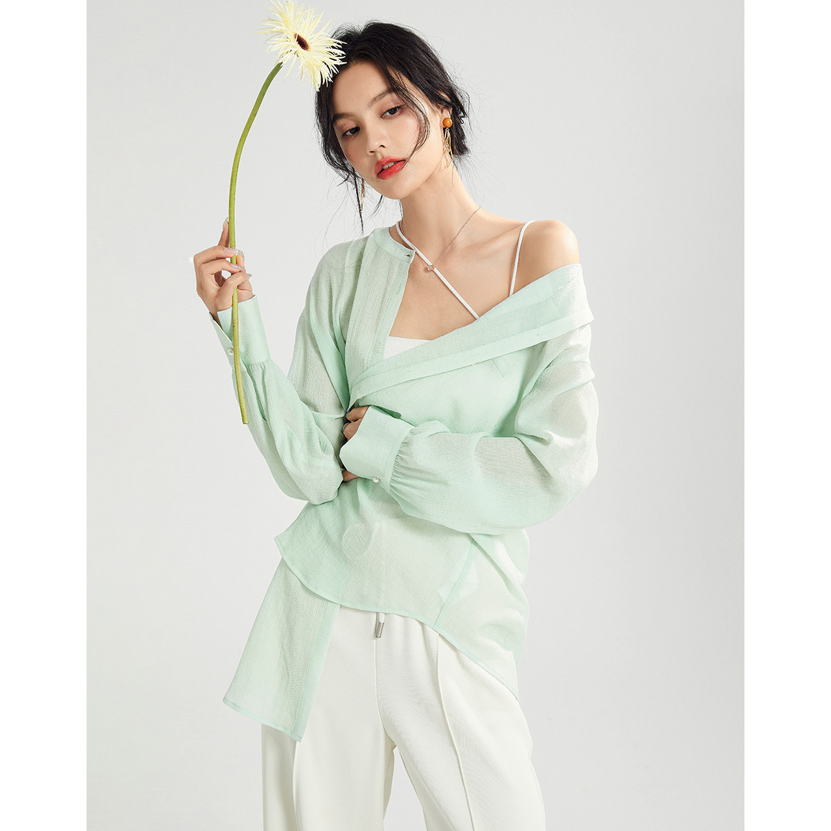 浅绿色薄款长袖衬衫女夏上衣高级感单排扣外穿衬衫 071128