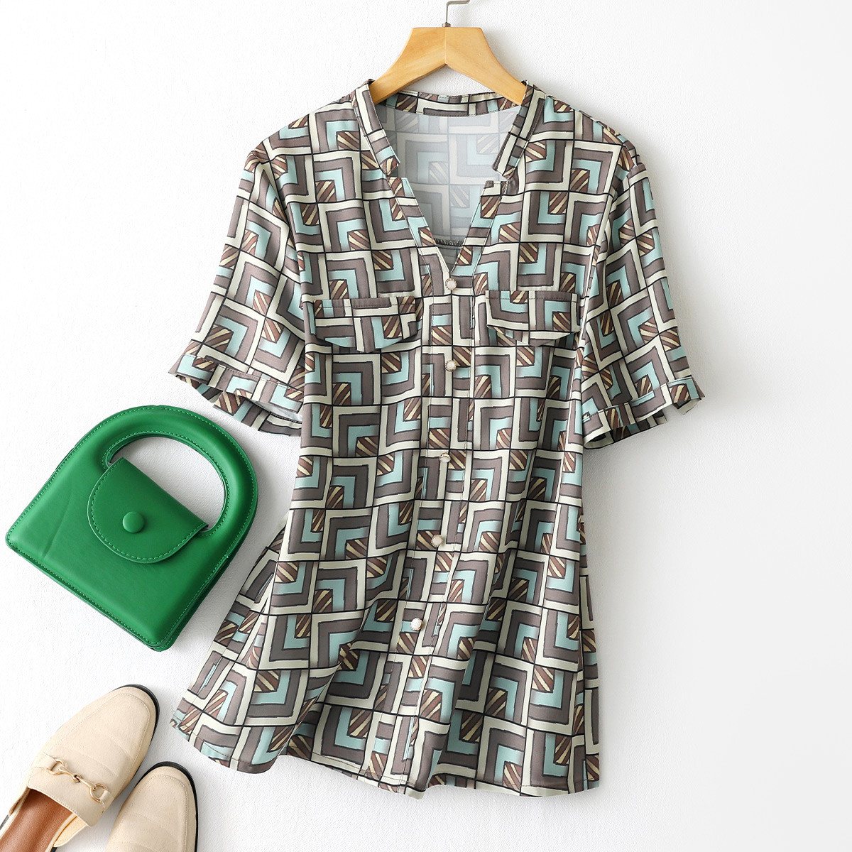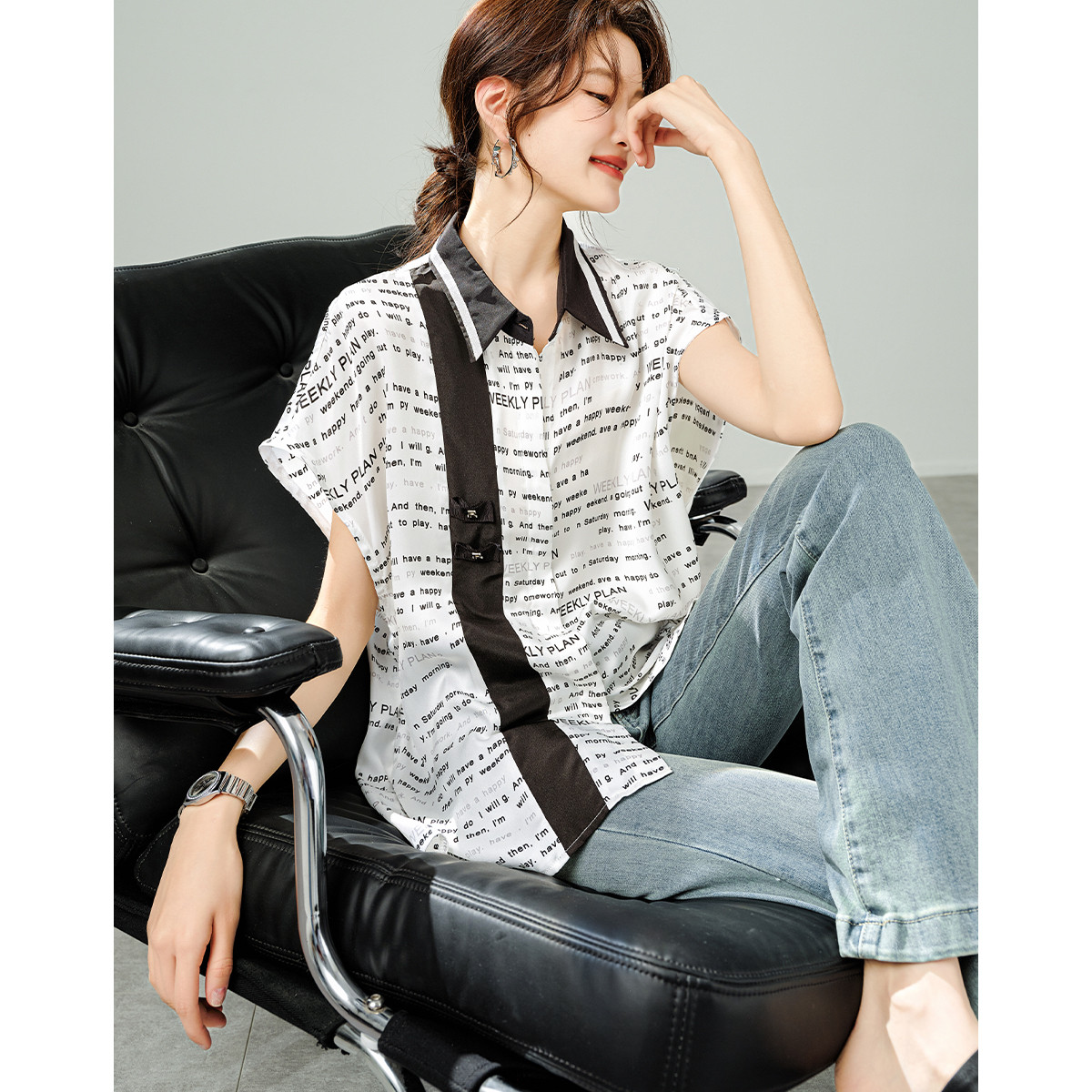 【时尚百搭】夏季百搭可拆卸蝴蝶结满印直筒衬衫女 083546