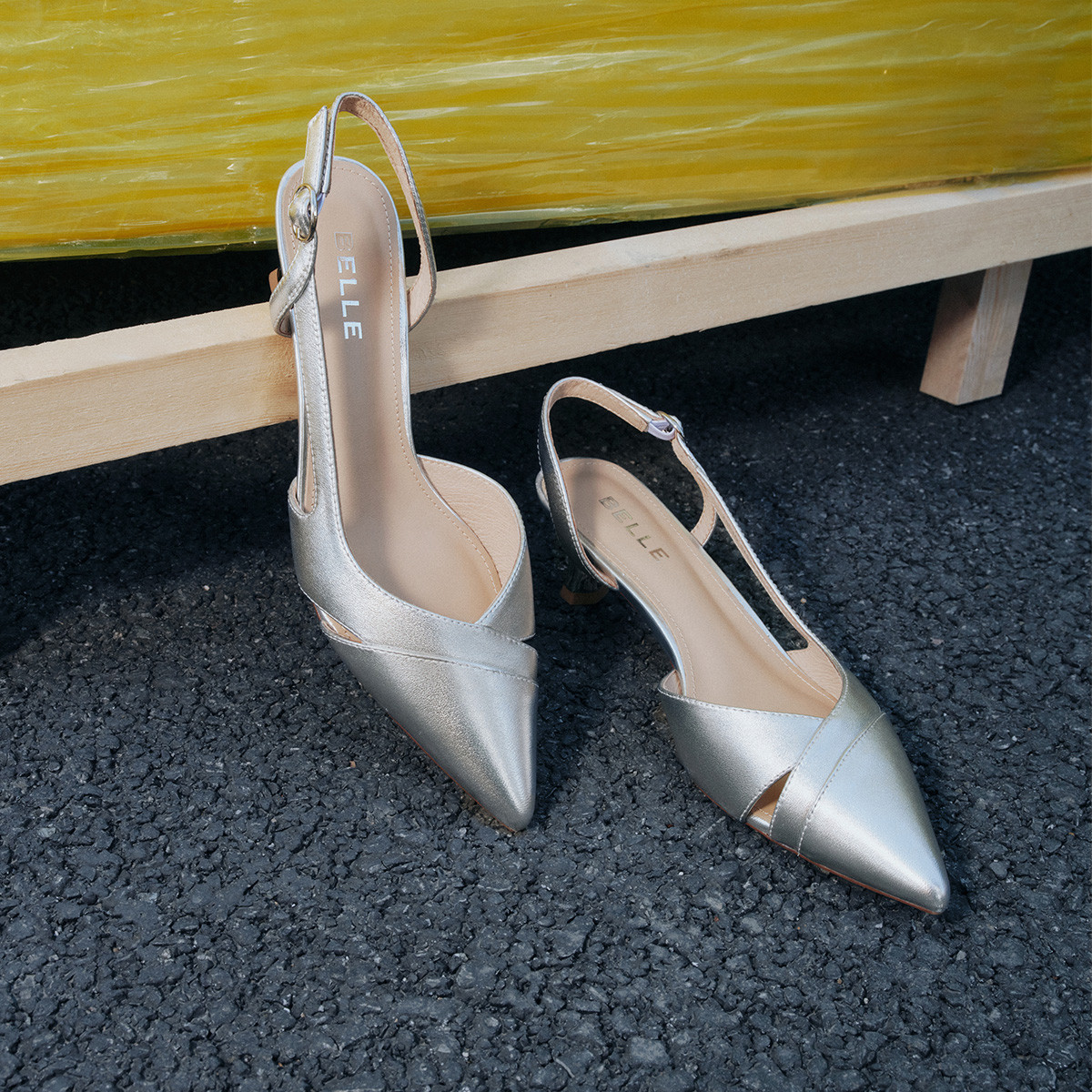 百丽女鞋花瓣尖头包头凉鞋春夏银色细高跟鞋子 032922