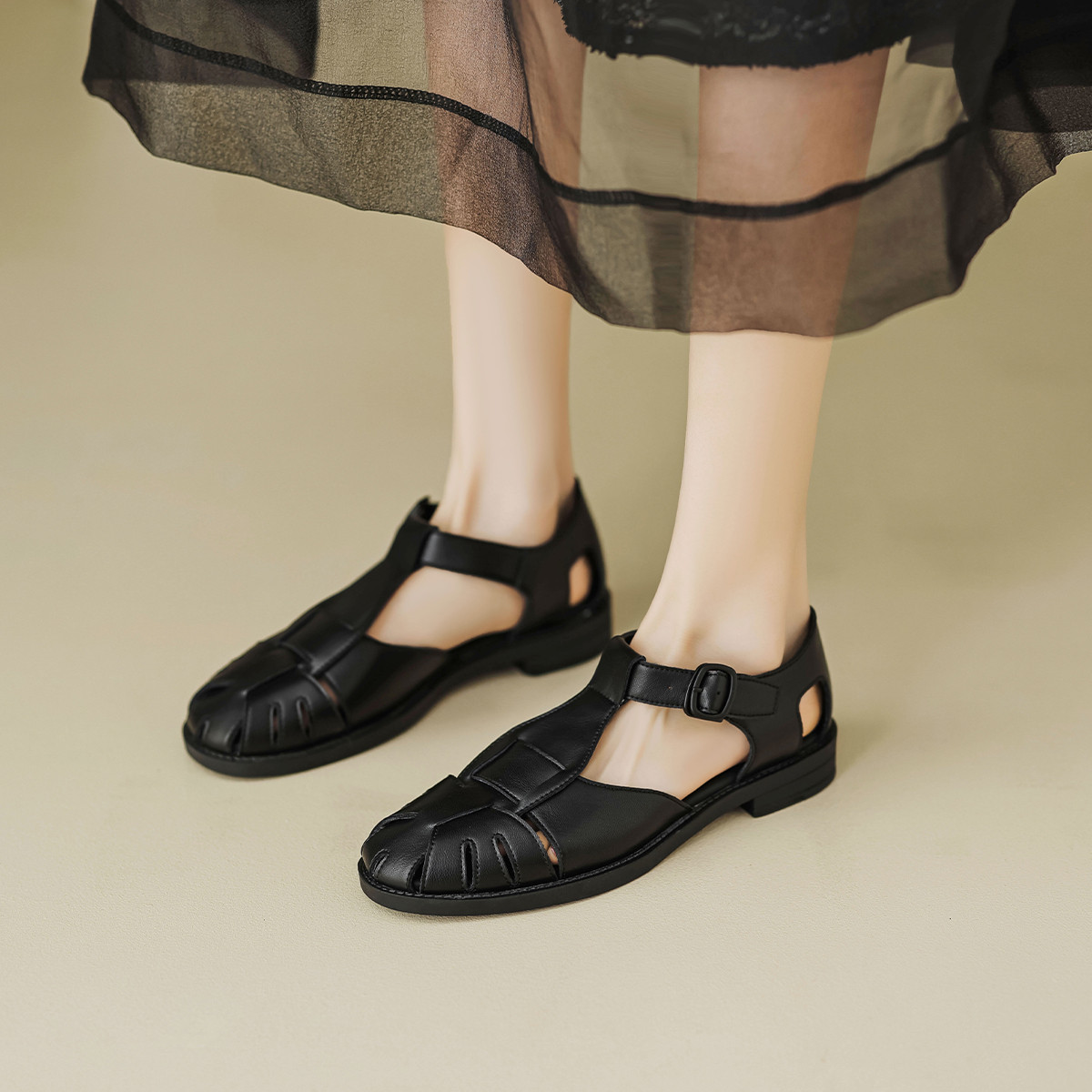 夏季简约百搭舒适镂空编织透气低跟猪笼鞋外穿休闲包头凉鞋女鞋子 085786