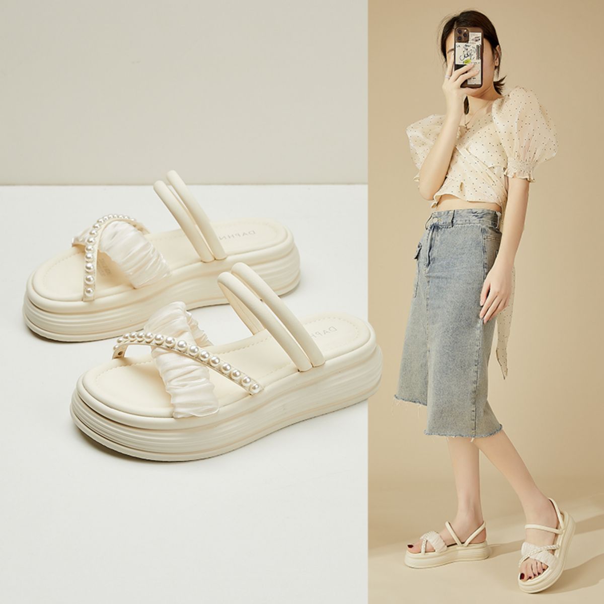 【盛夏热卖】夏季拖鞋女外穿珍珠一字带时装凉拖百搭沙滩拖鞋 613079