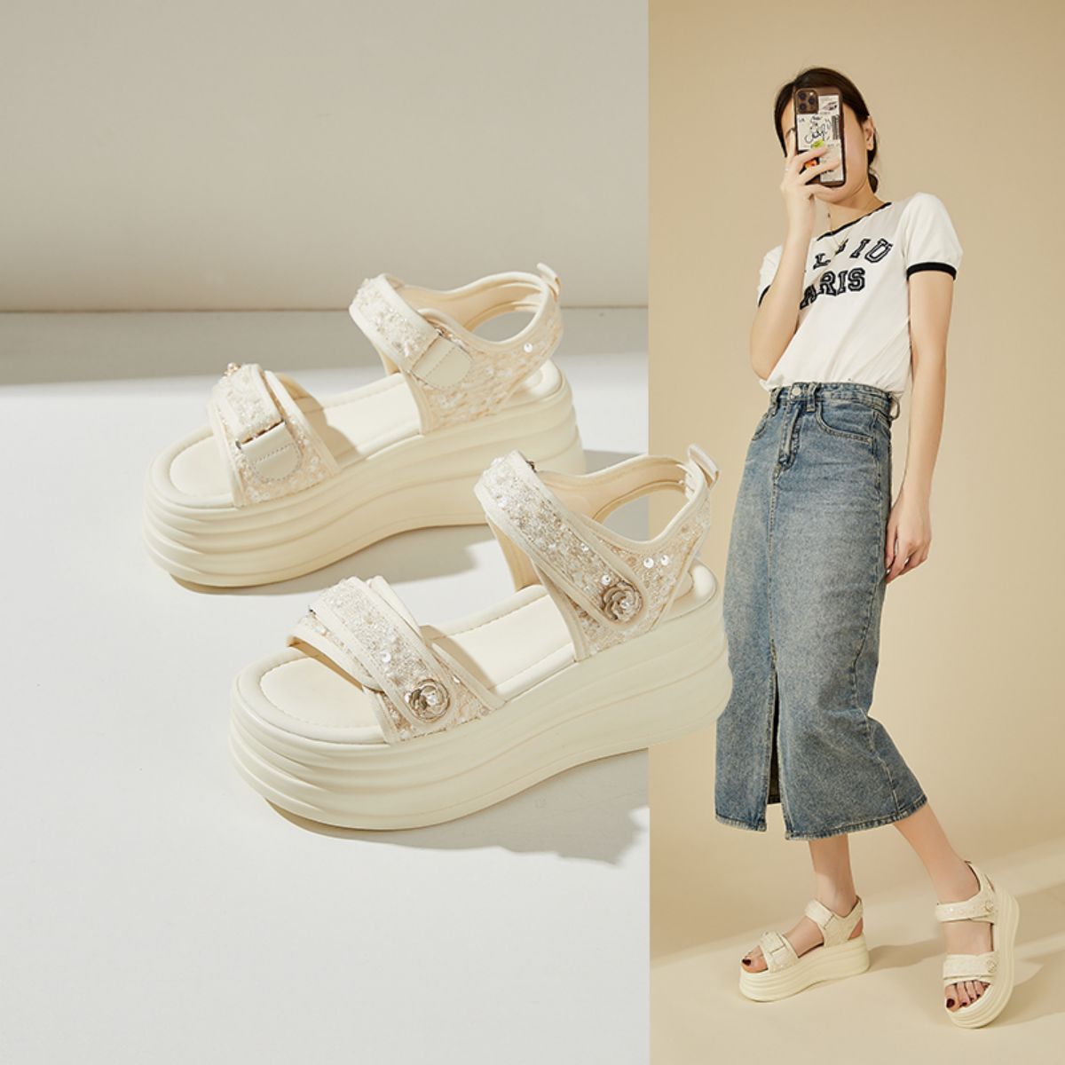 【厚底增高】爆款夏季运动凉鞋女厚底沙滩凉鞋亮片一字带凉拖鞋 189975
