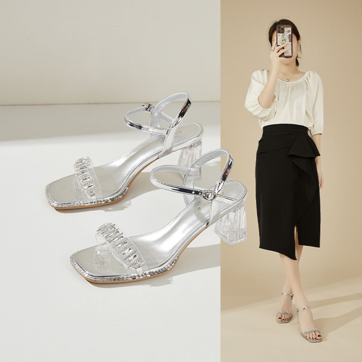 【时尚爆款】夏季潮流女鞋气质一字带高跟鞋水晶方跟凉鞋女鞋 027799