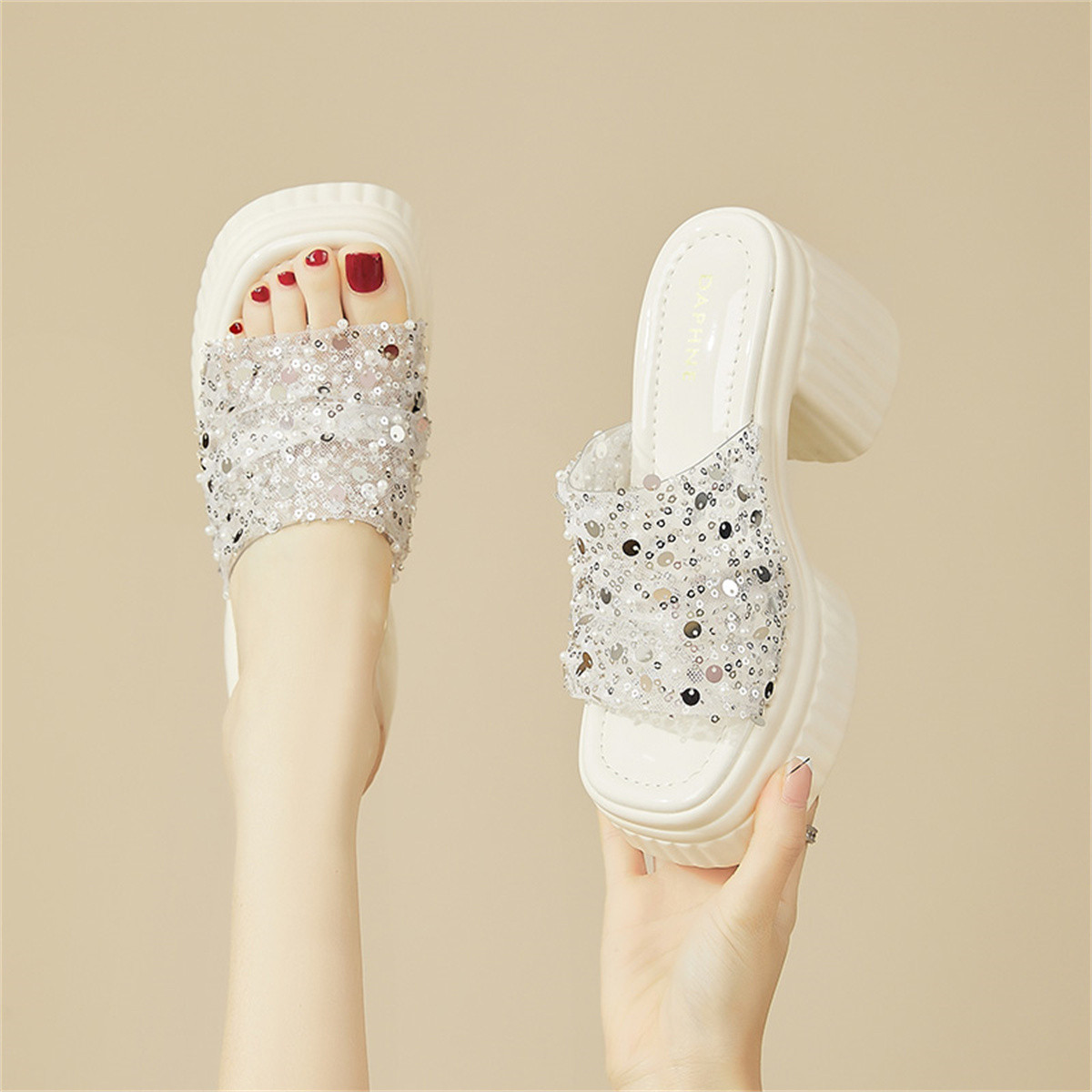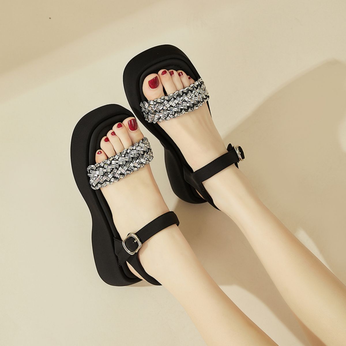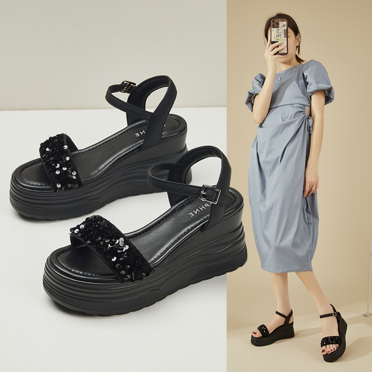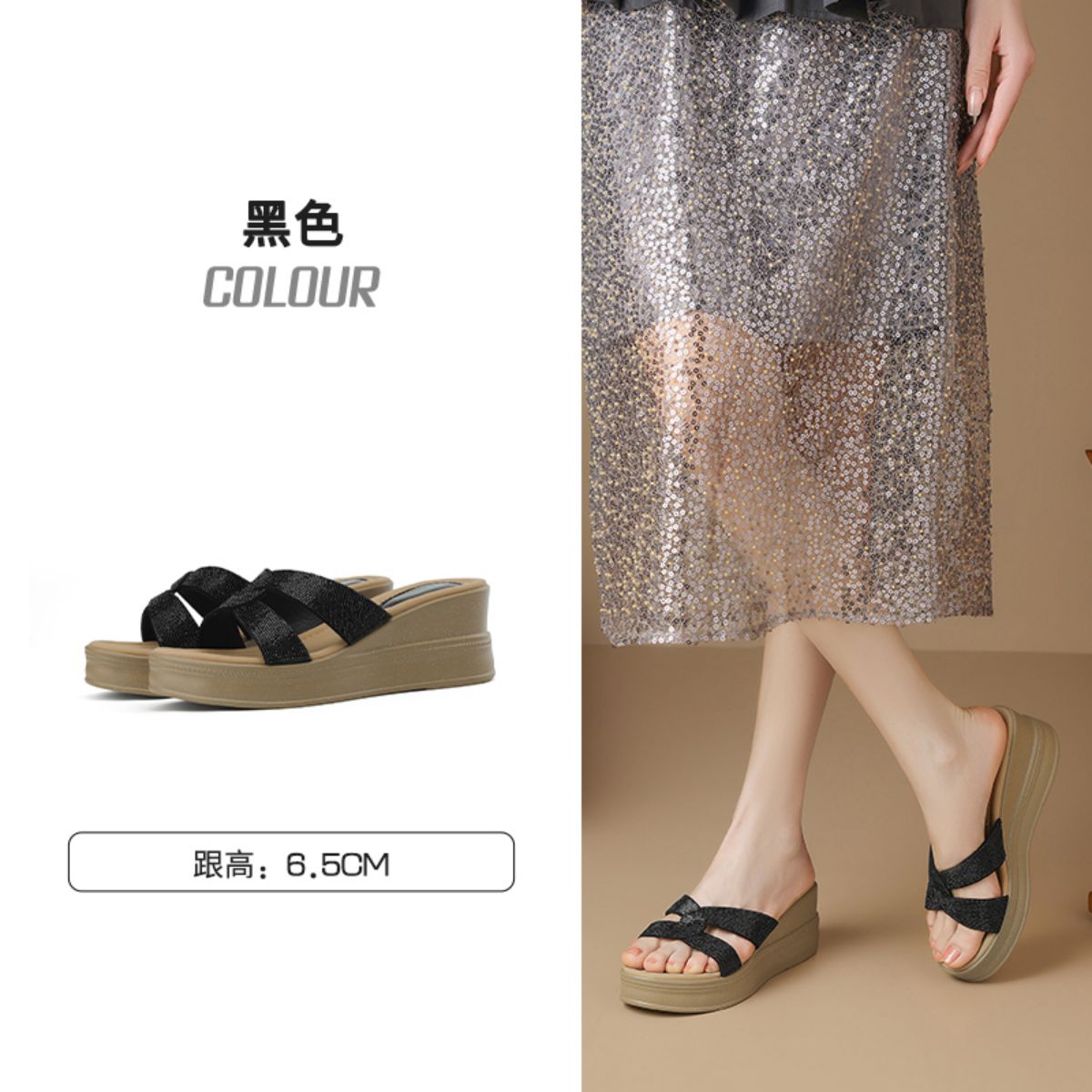 【秒增7.5】夏厚底百搭女鞋亮片露趾坡跟凉鞋一字带凉鞋 221079