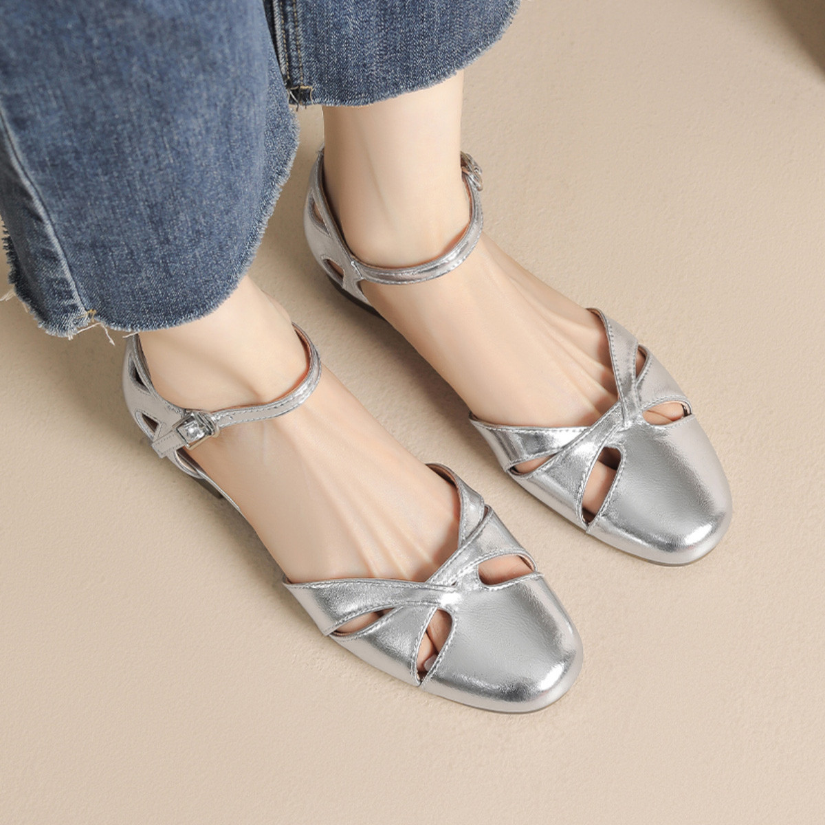 银色皮鞋包头凉鞋女夏季平底罗马镂空包头外穿单鞋 818010