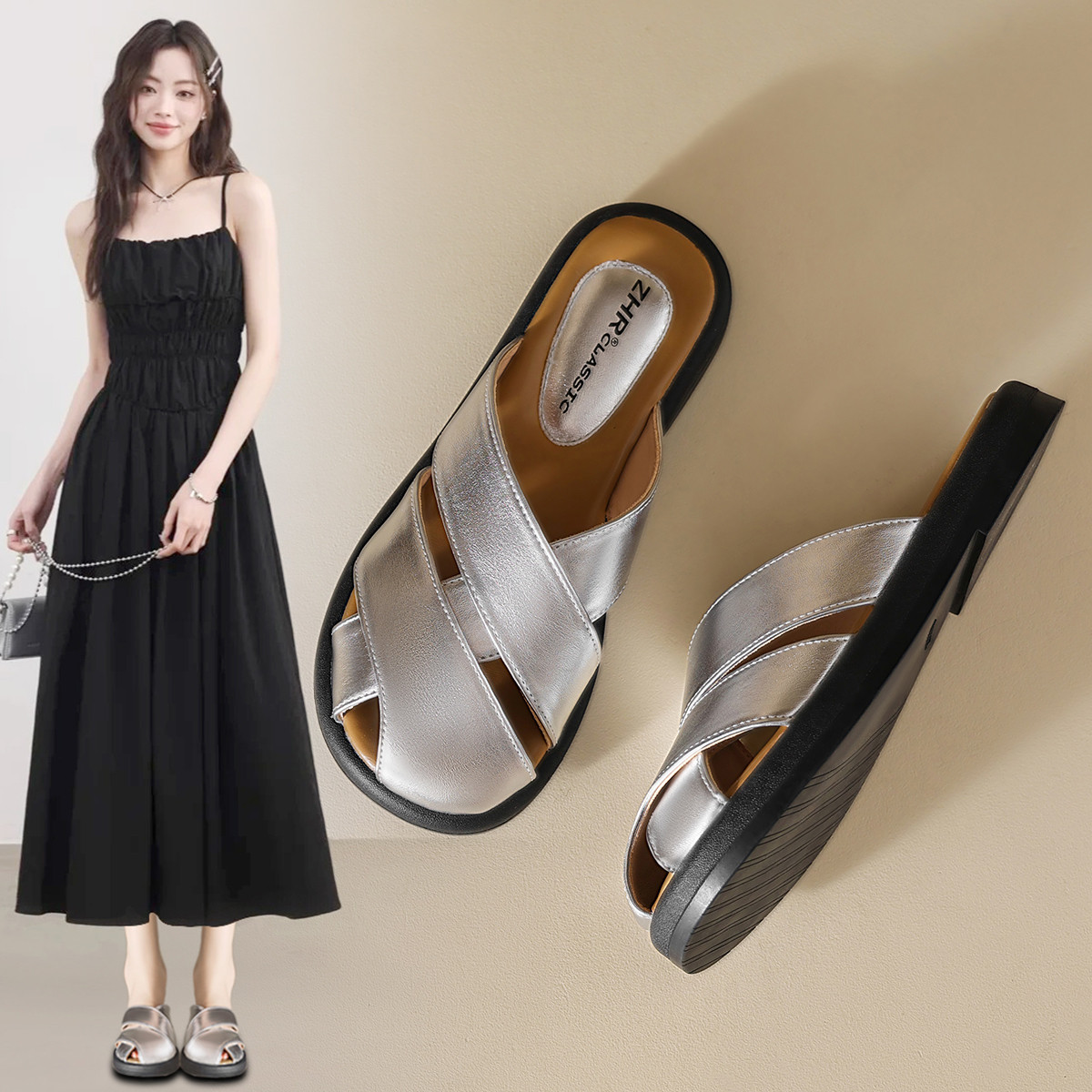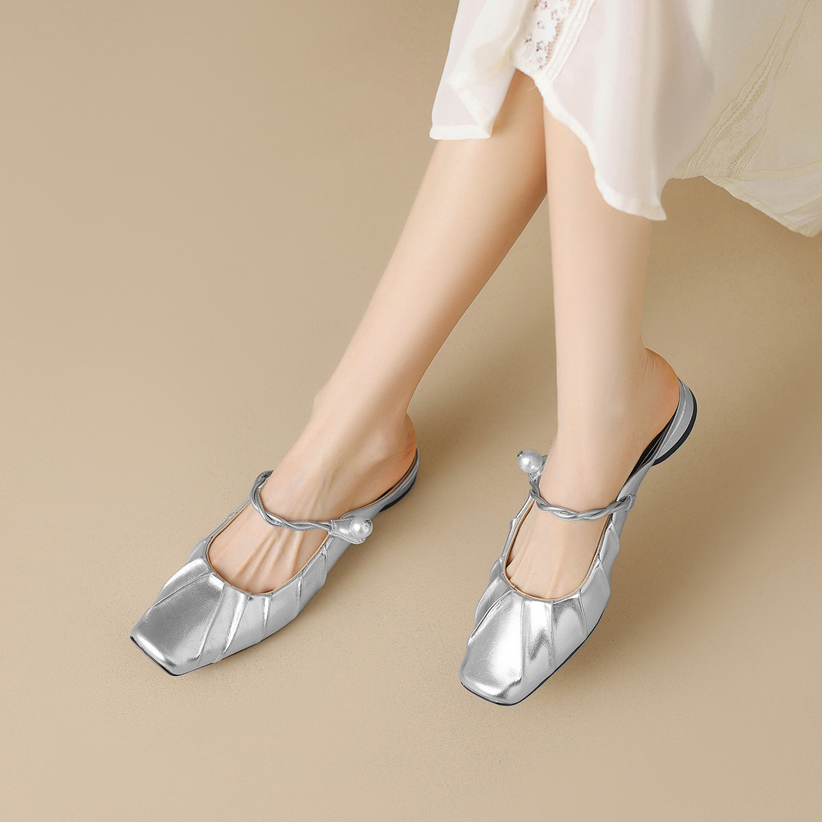 银色包头半拖鞋女夏季皮鞋玛丽珍凉拖外穿平底单鞋 152474