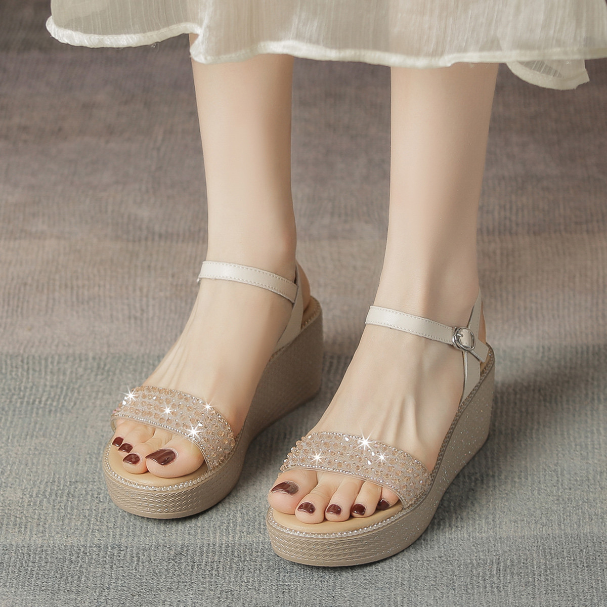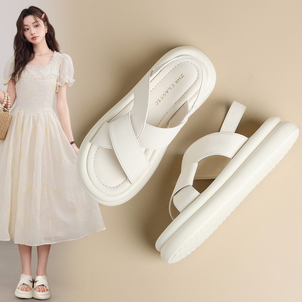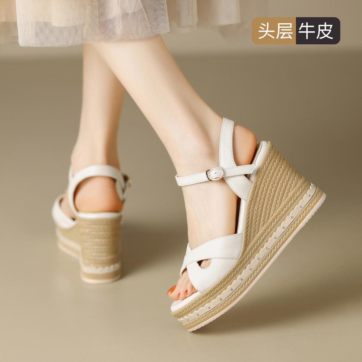 【头层牛皮】交叉束带坡跟女凉鞋一字带凉鞋女百搭小个子高跟凉鞋 562880