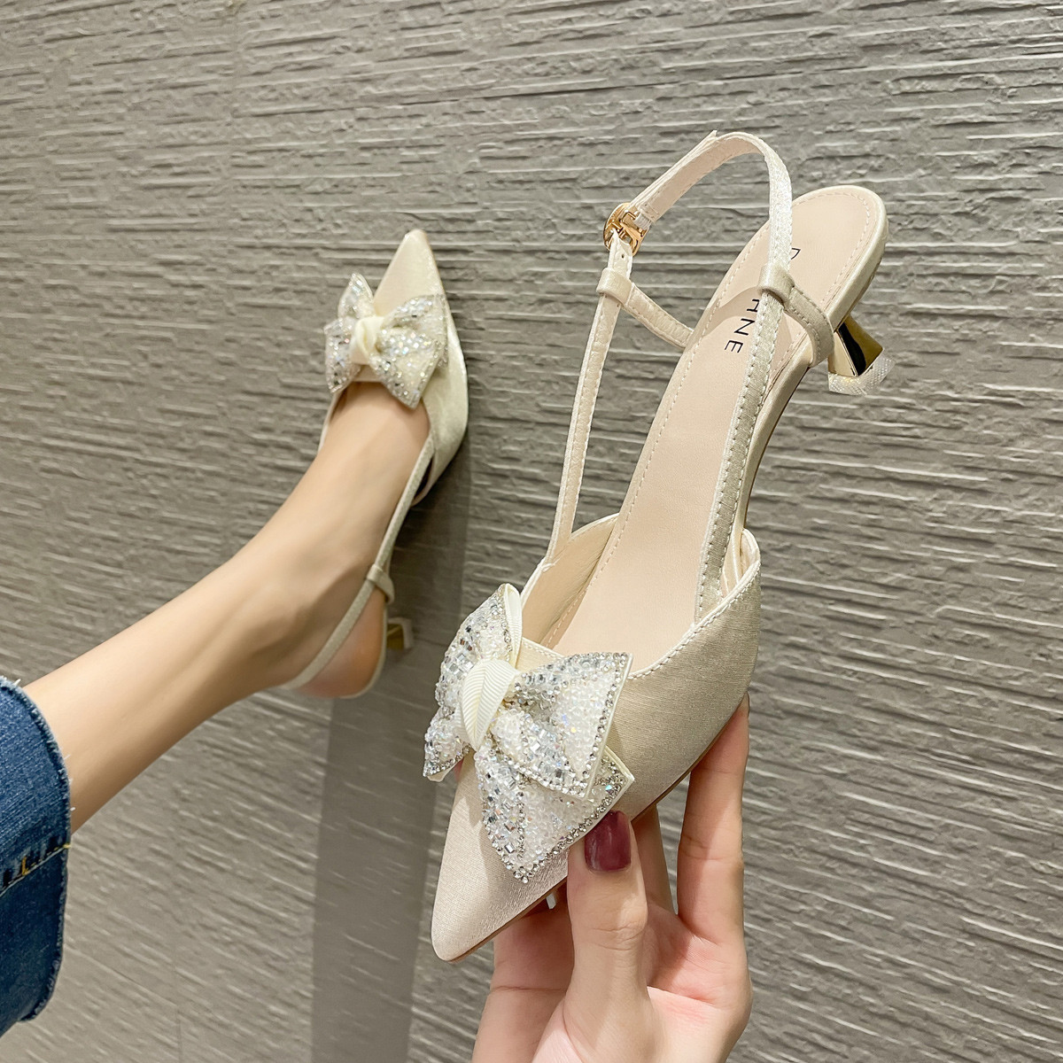 夏季时尚亮片单鞋后空凉鞋尖头高跟鞋女细跟一字带扣饰单鞋聚会鞋 874519