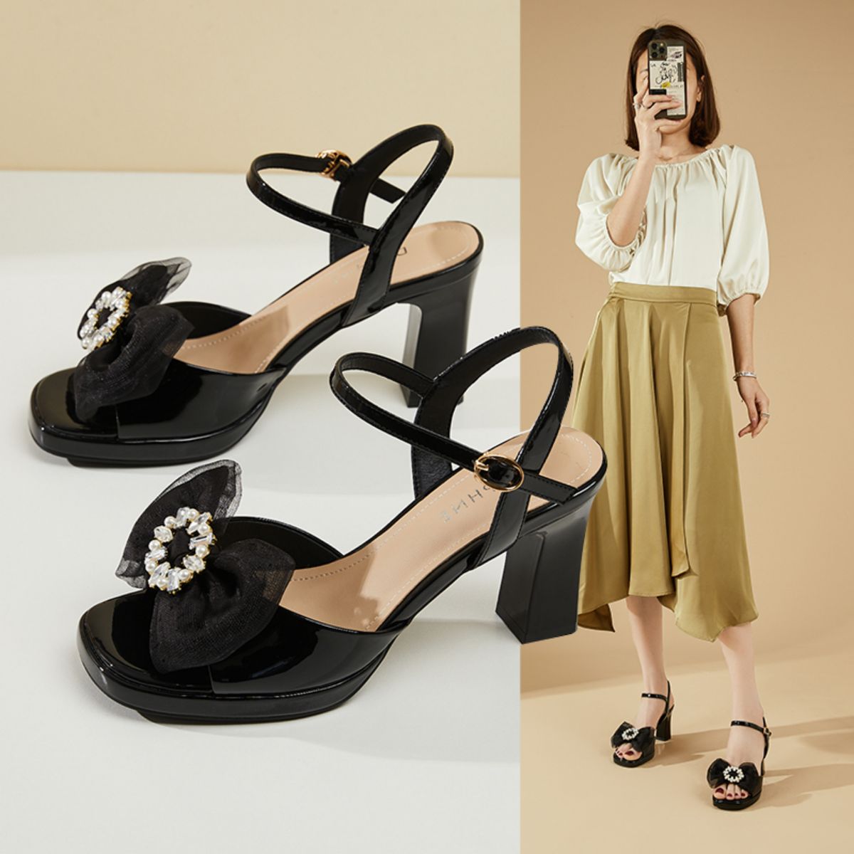 【秒增7CM】夏季蝴蝶结凉鞋女百搭一字带凉鞋通勤鞋中空高跟鞋 570903