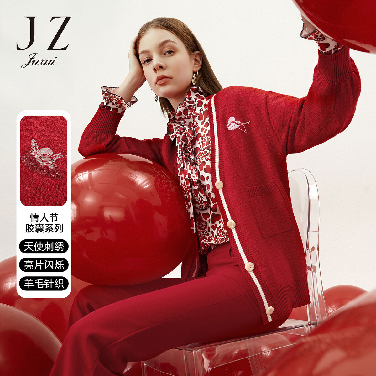 玖姿春季V领时尚休闲红色女式针织衫 541004