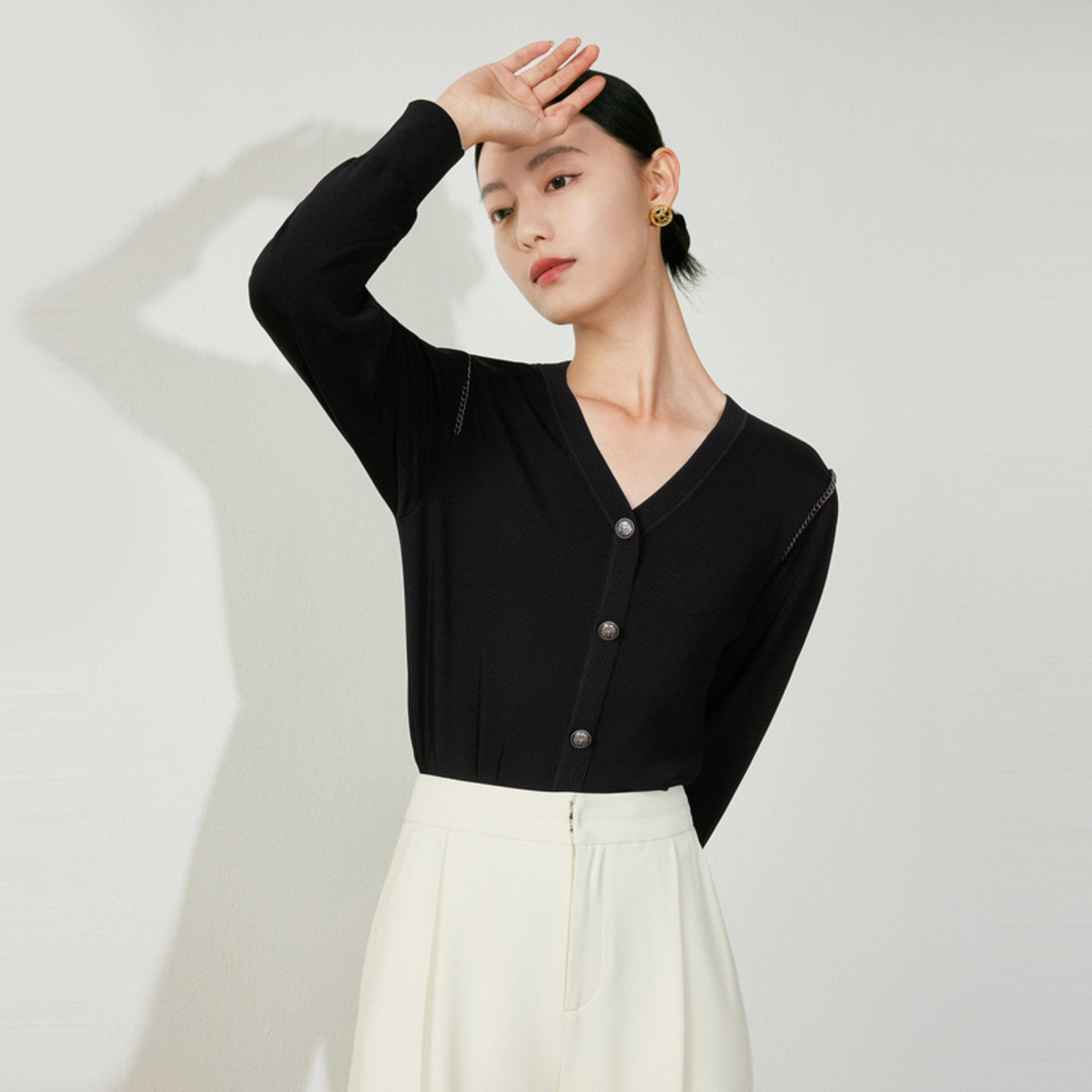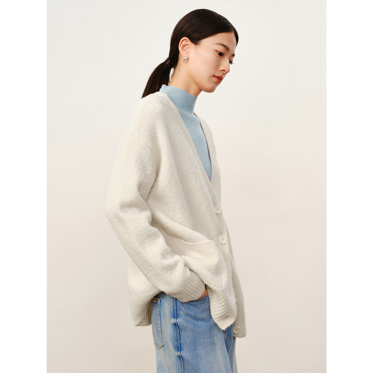 玖姿旗下安娜蔻系列慵懒风松弛V领绵羊毛开衫毛衣女冬季 446476