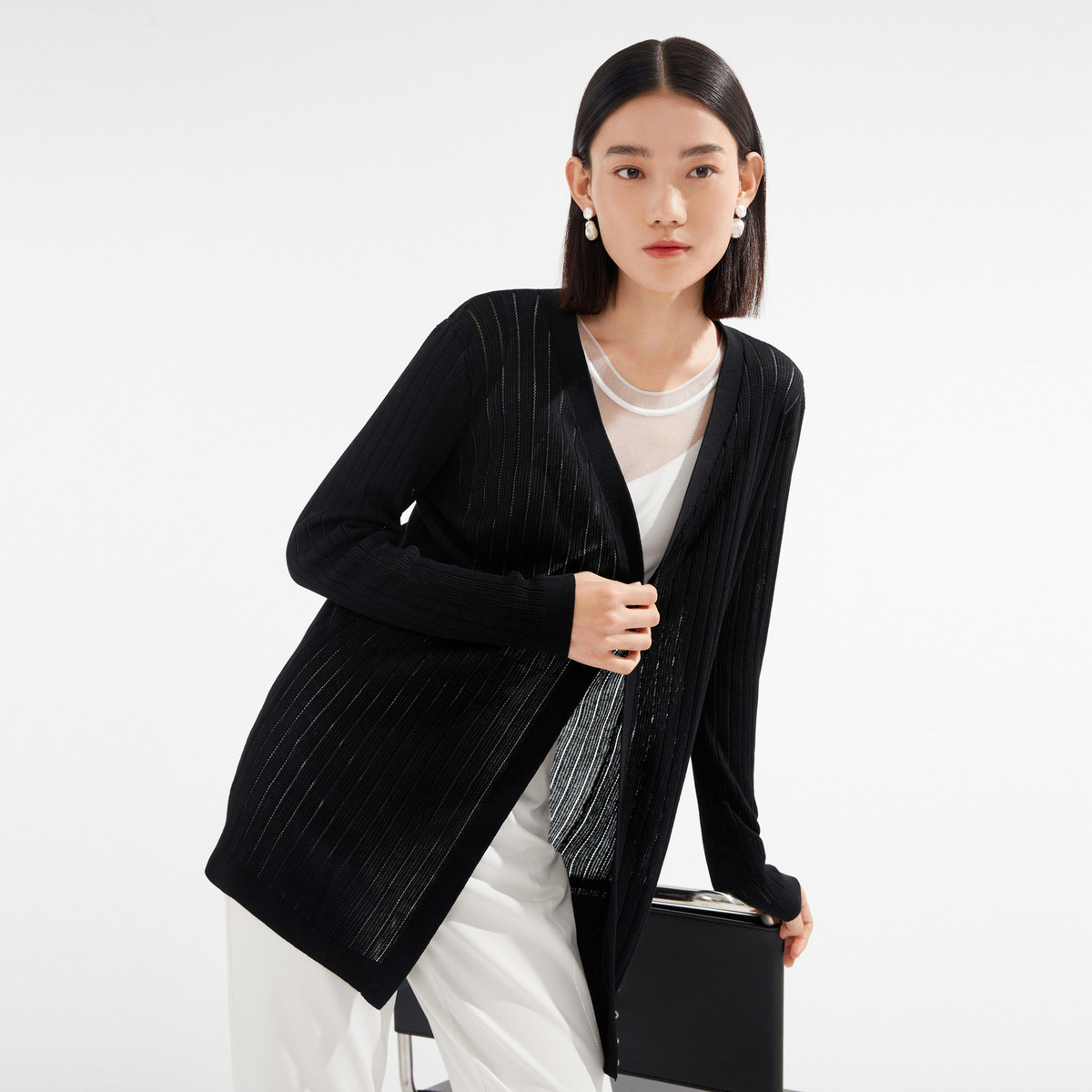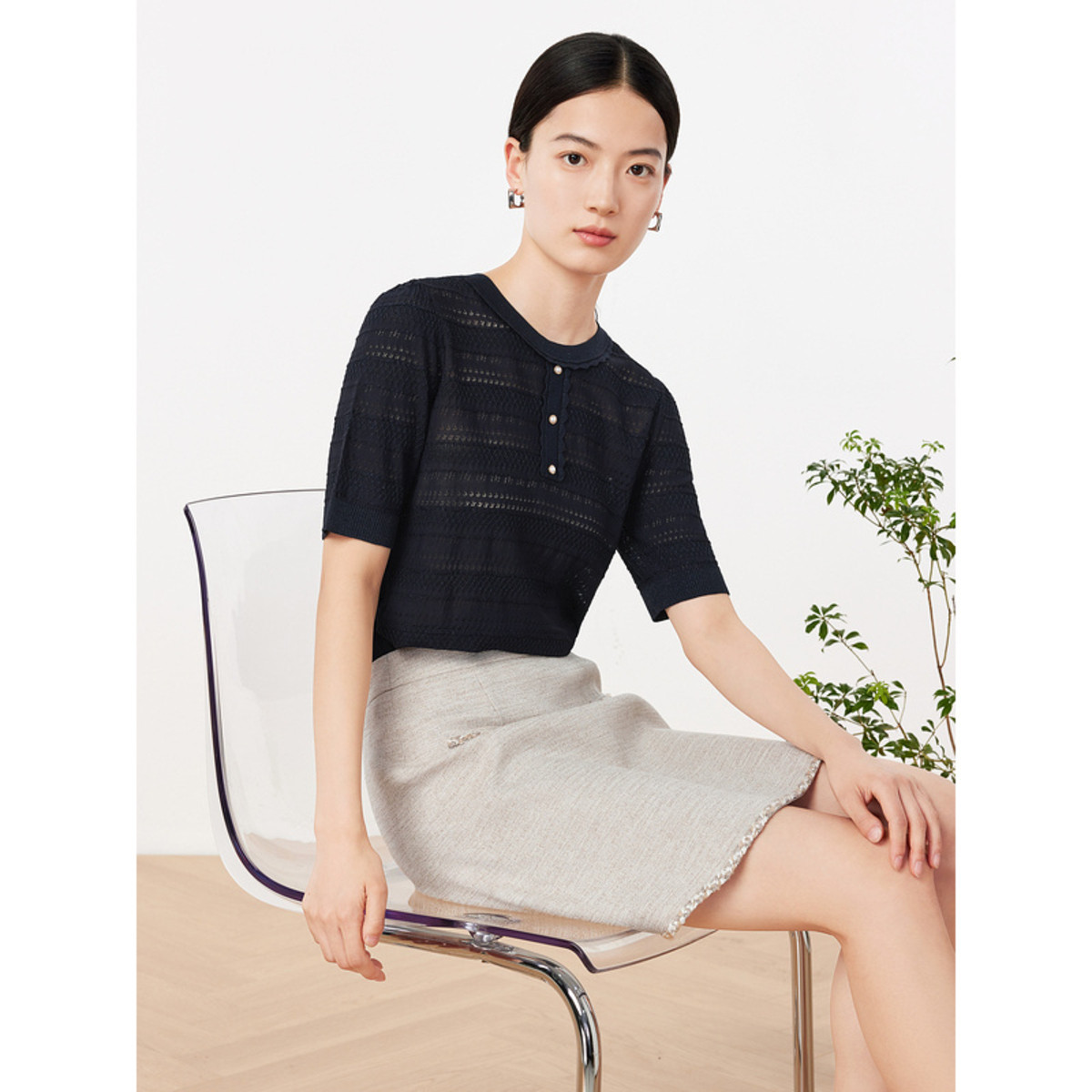 玖姿夏季镂空透气优雅珍珠扣女式针织衫 484236