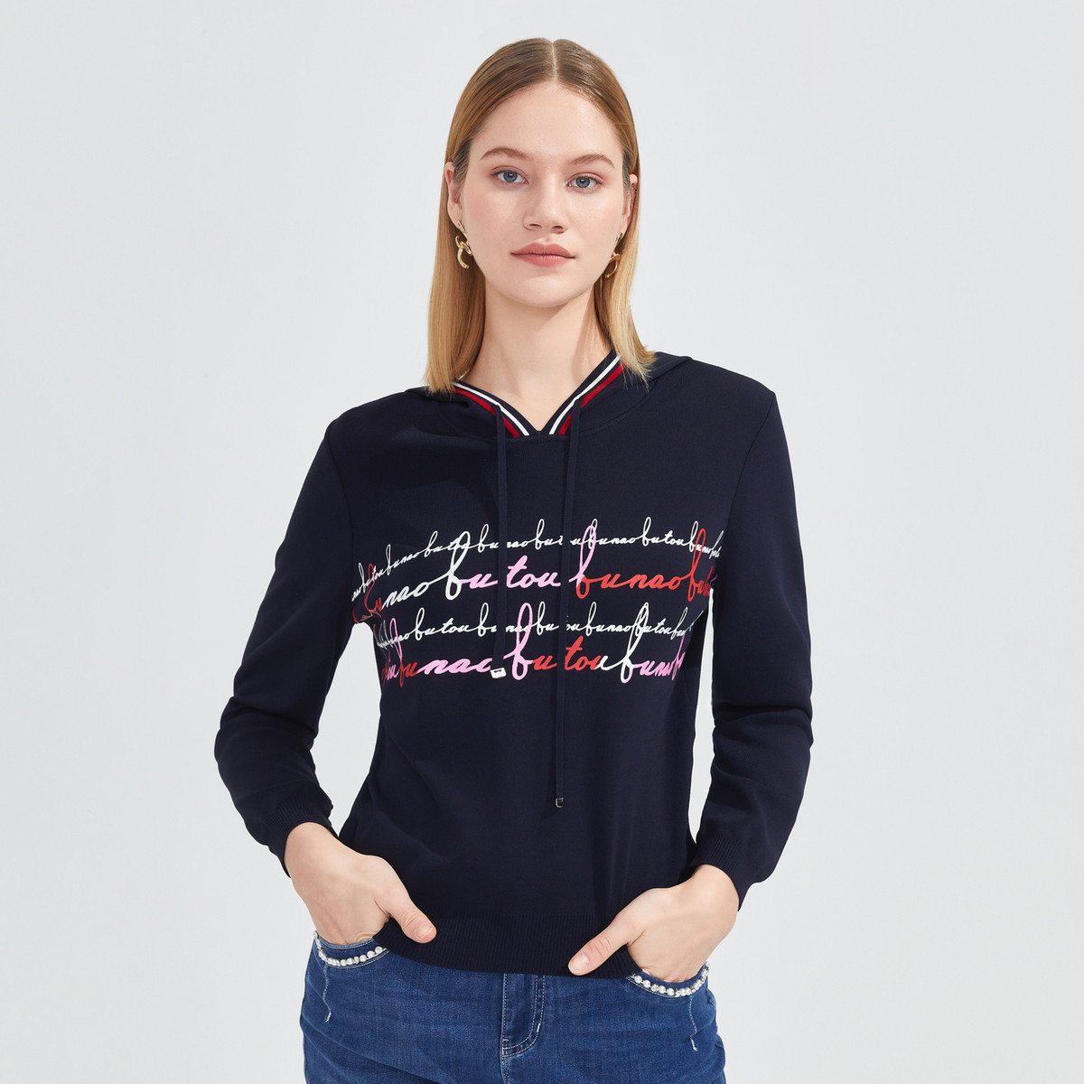 JZ玖姿商场同款黑字母小衫女装春季休闲连帽针织衫 286348