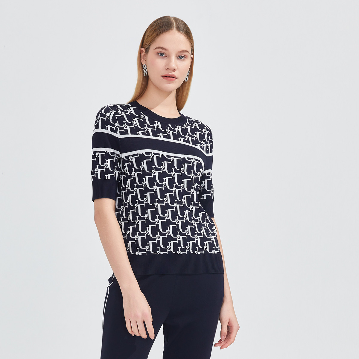 JZ玖姿简约套头设计感单上衣女装春季字母条纹针织衫 022860