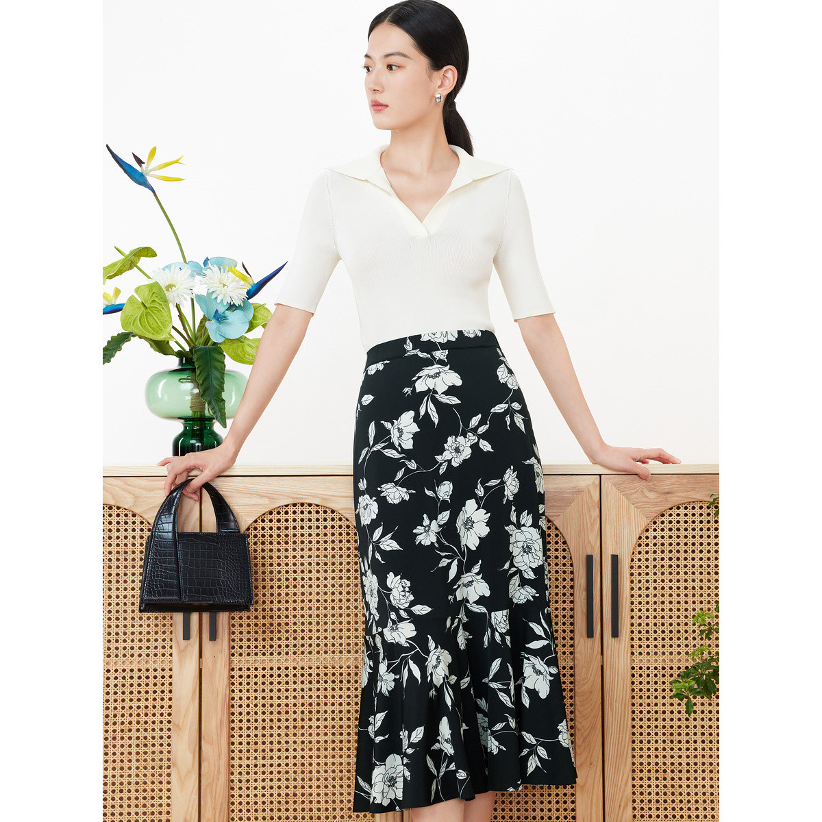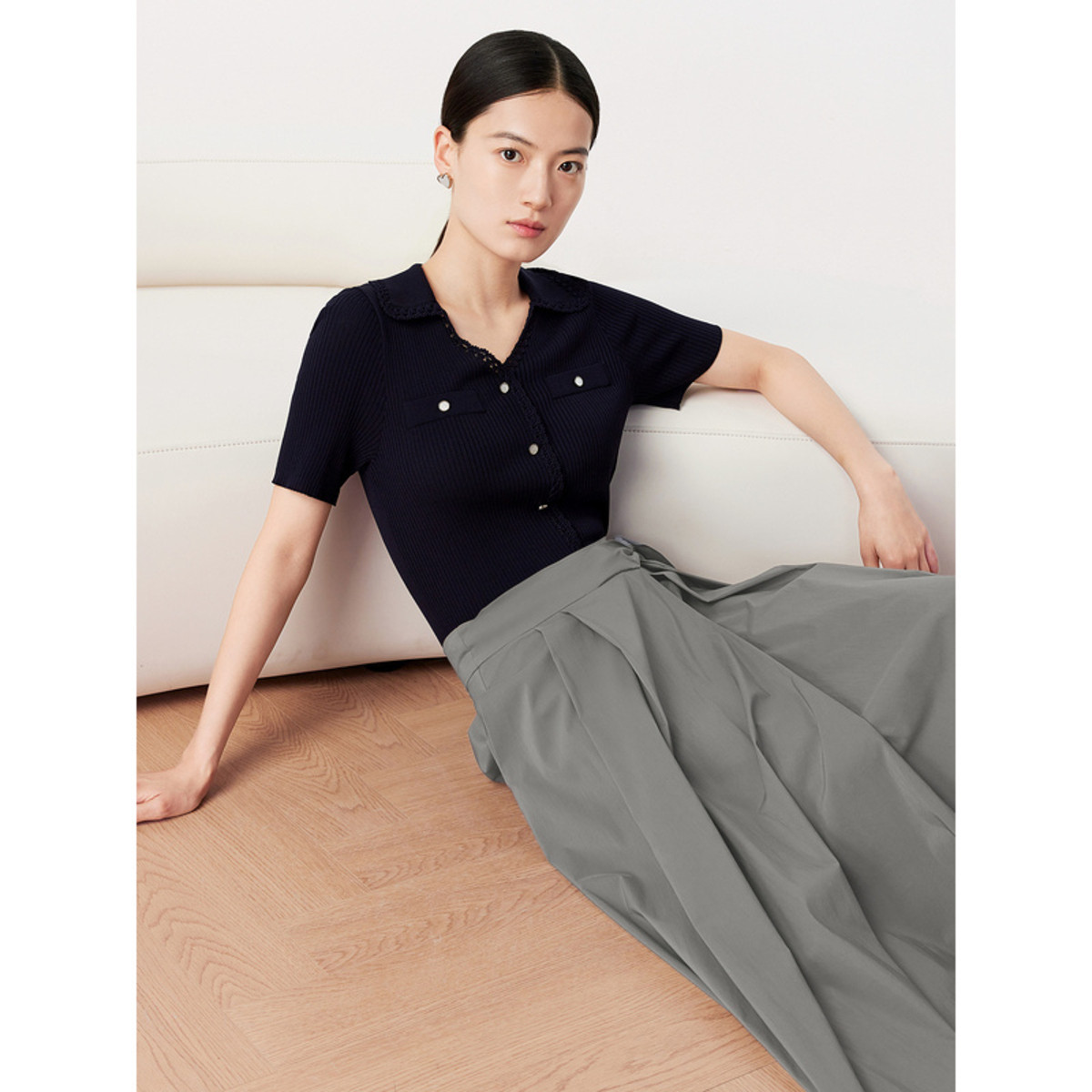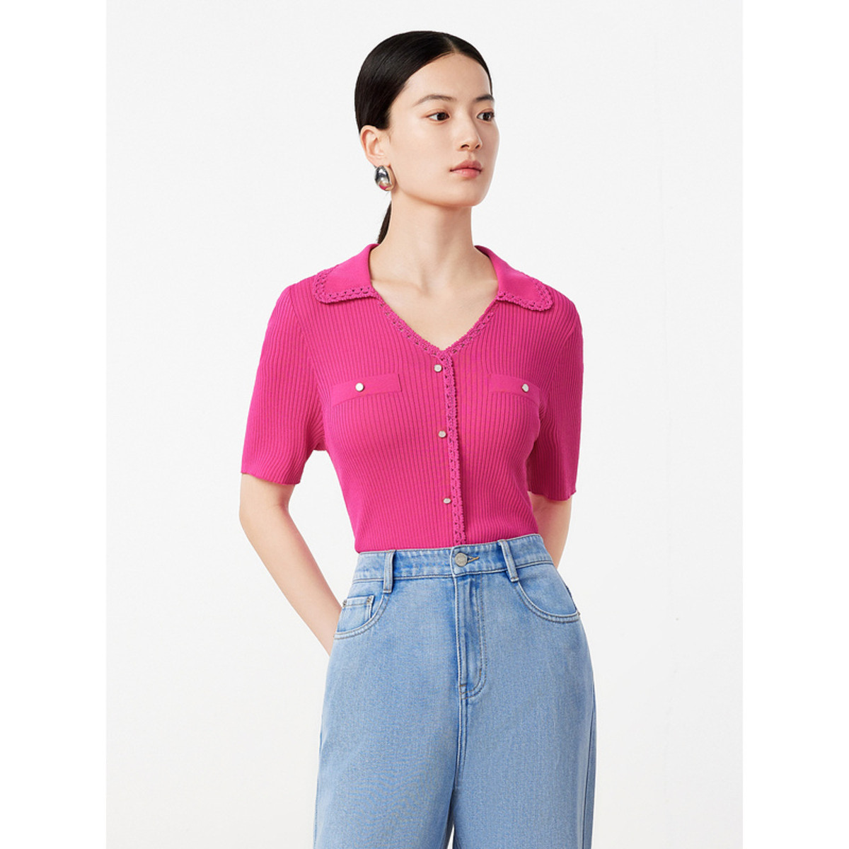 玖姿旗下安娜蔻系列通勤三醋酸针织衫女装夏季气质翻领针织上衣 797900