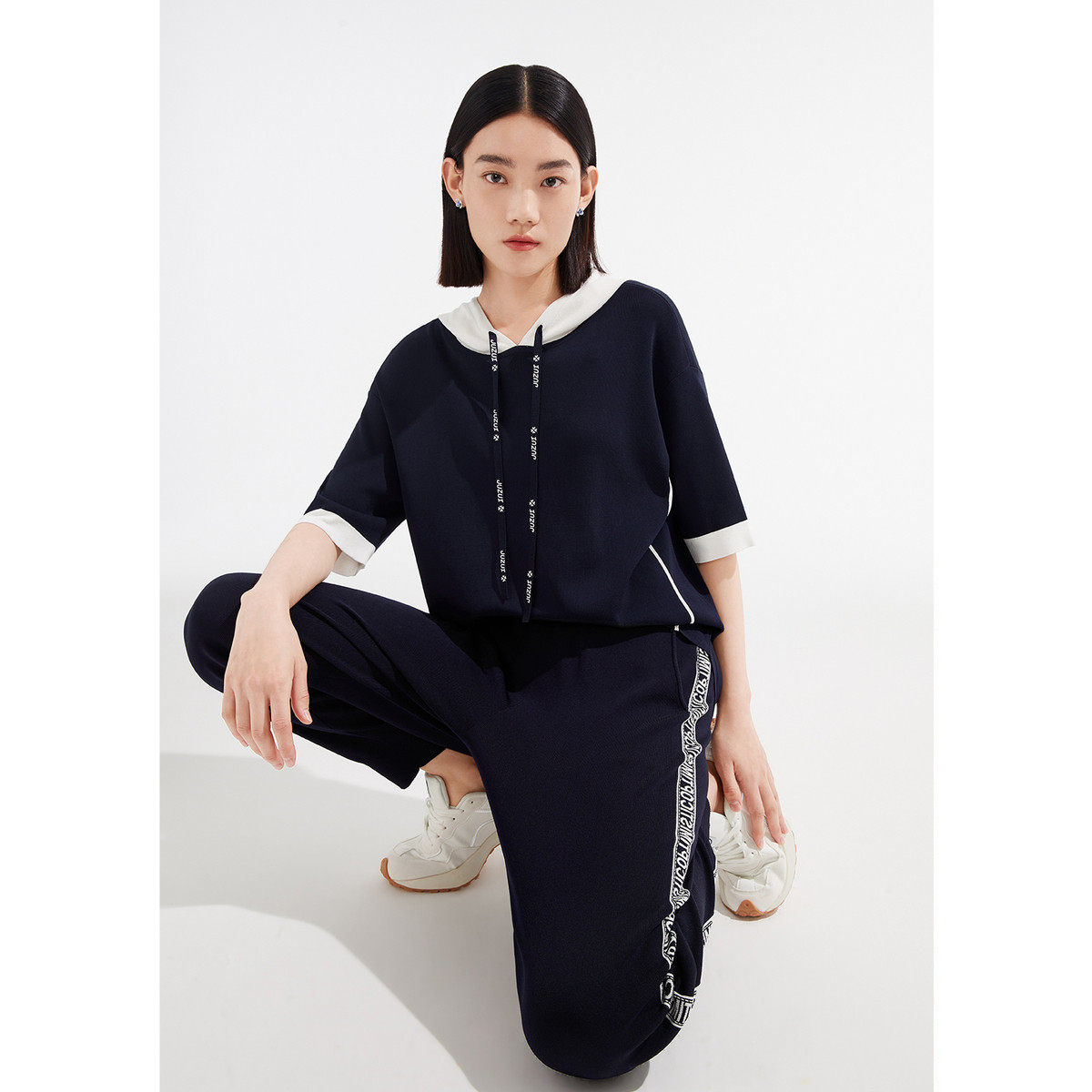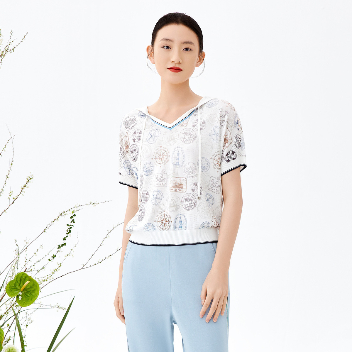 JZ玖姿夏季时尚拼色印花弹力休闲四叶草针织帽衫女 433228