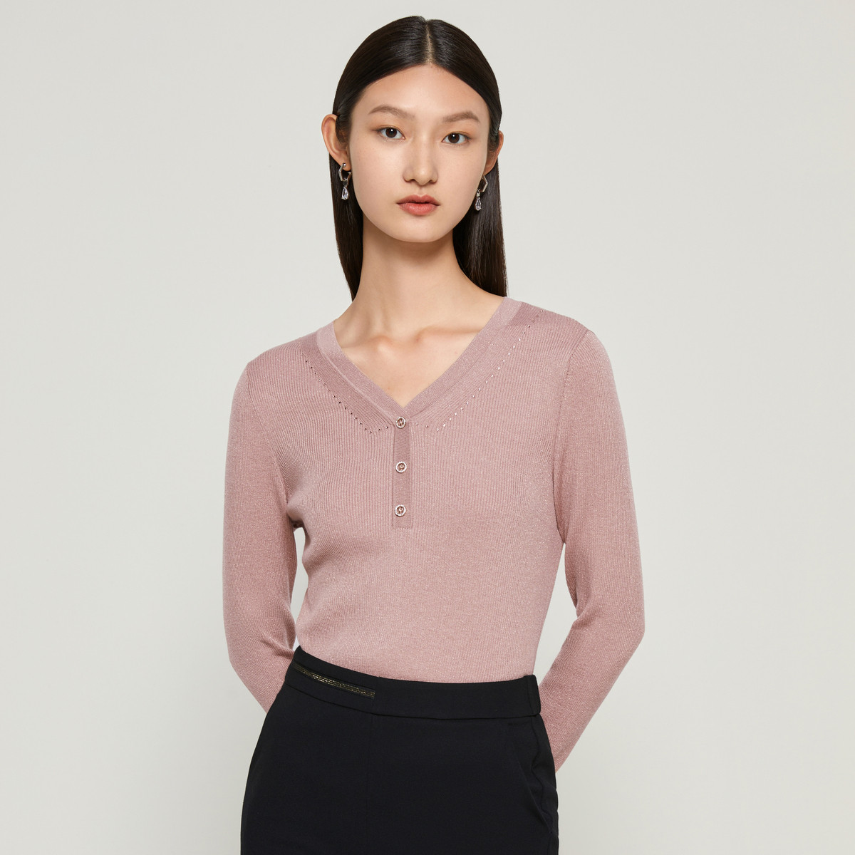 JZ玖姿双色混纺云感针织衫女装秋季气质V领打底衫毛衣 380428