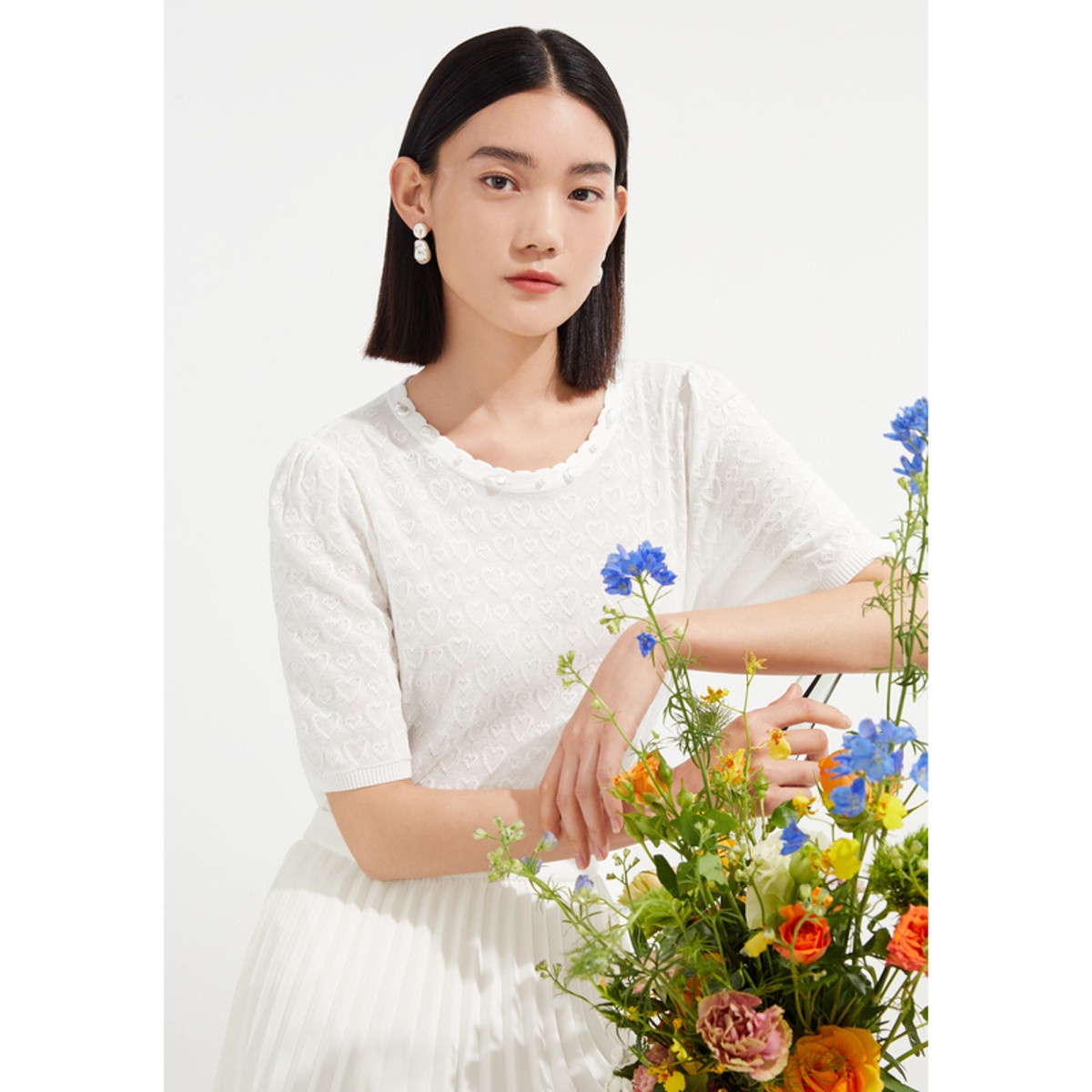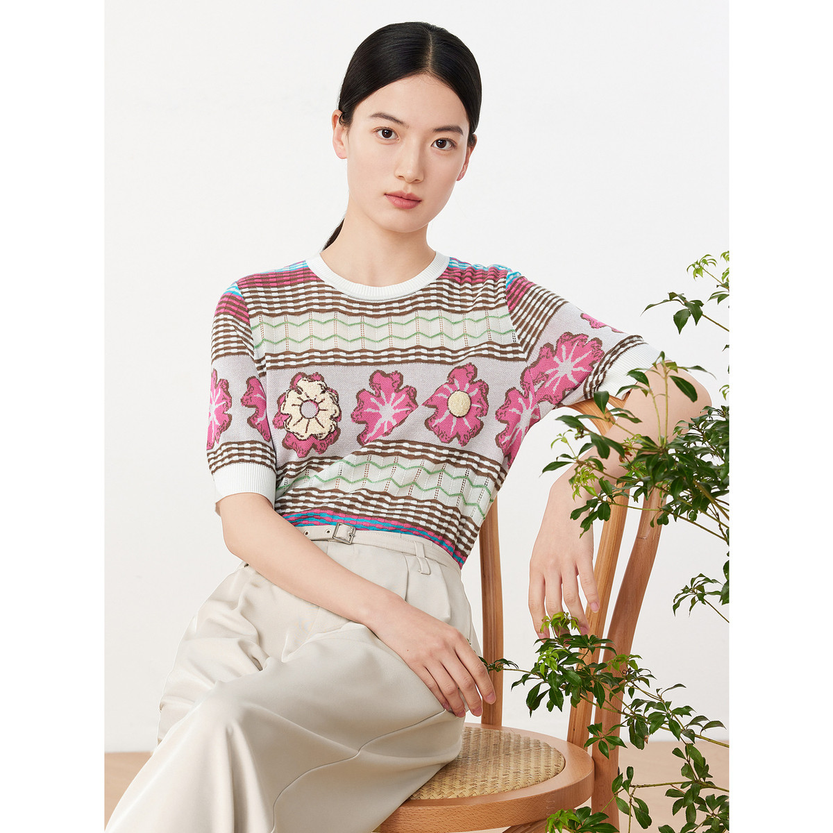 玖姿旗下安娜蔻系列轻熟直筒镂空针织短袖套头毛衫女夏季 079052