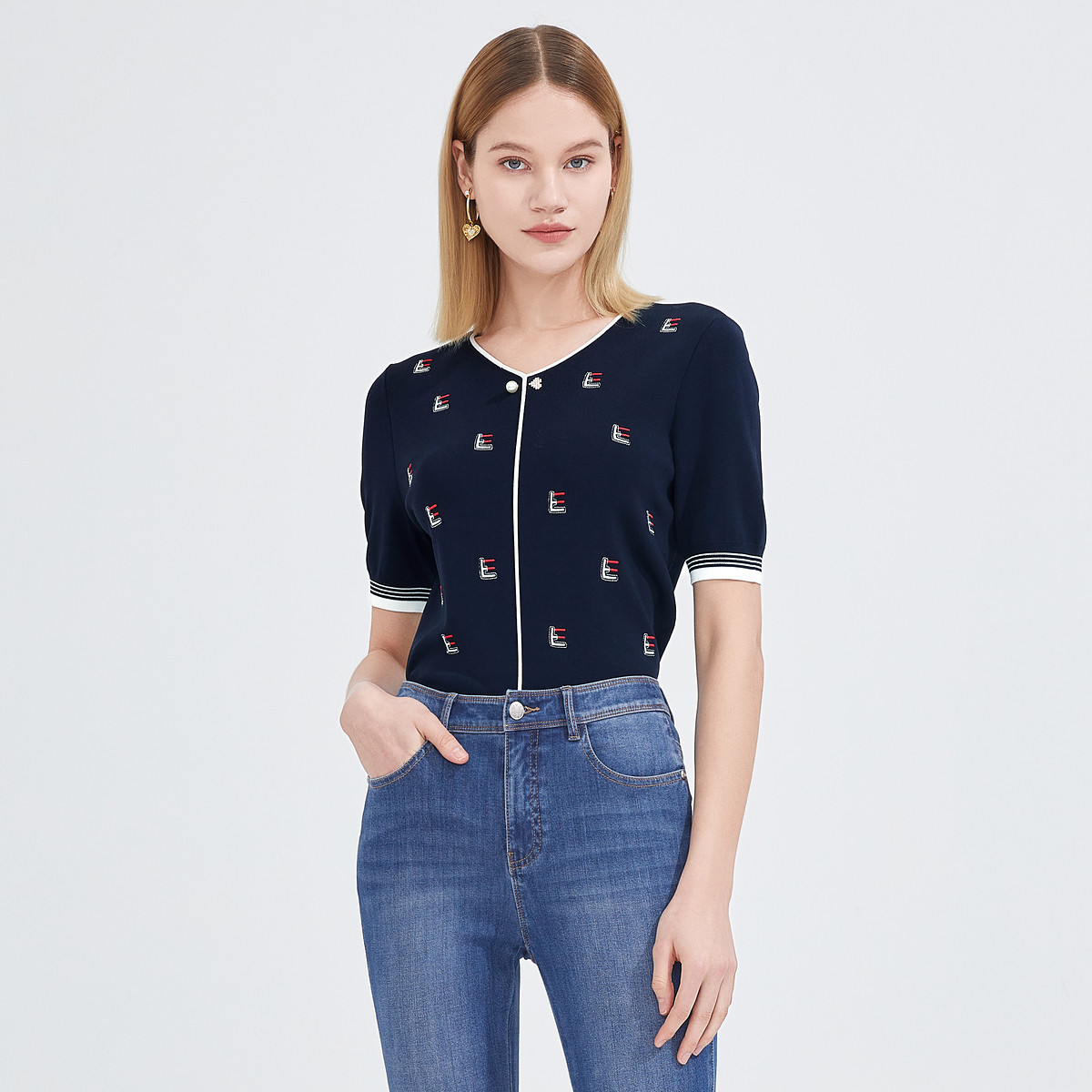 玖姿夏季温柔知性时尚绣花V领女式短袖针织衫 501964