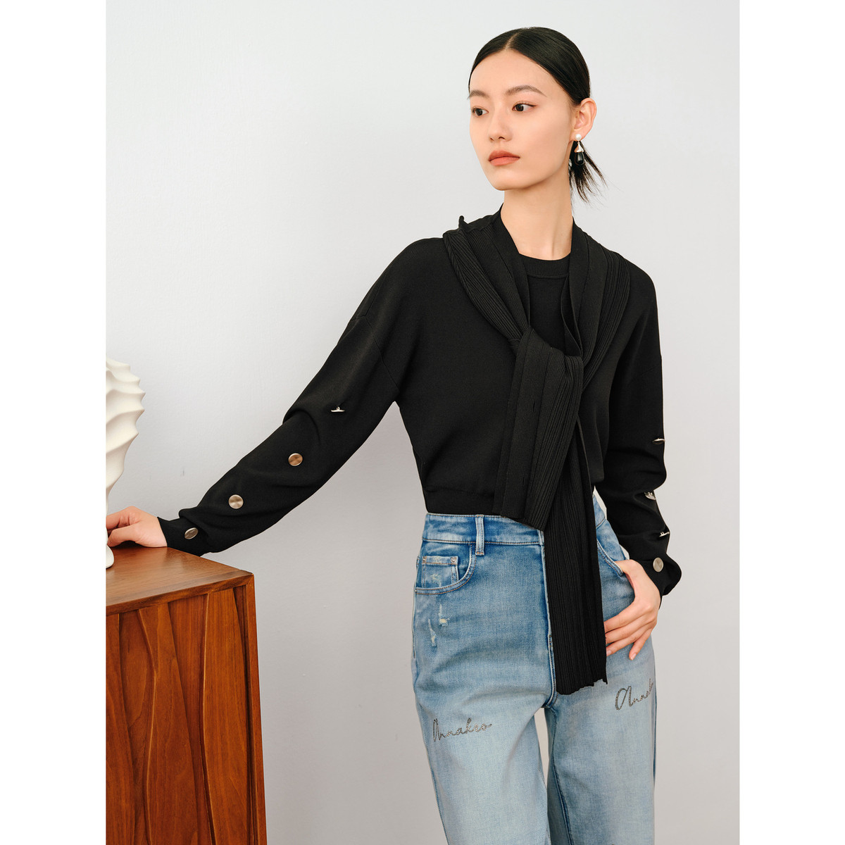 玖姿旗下安娜蔻系列时髦长袖优雅两件套套头针织衫女秋 005452