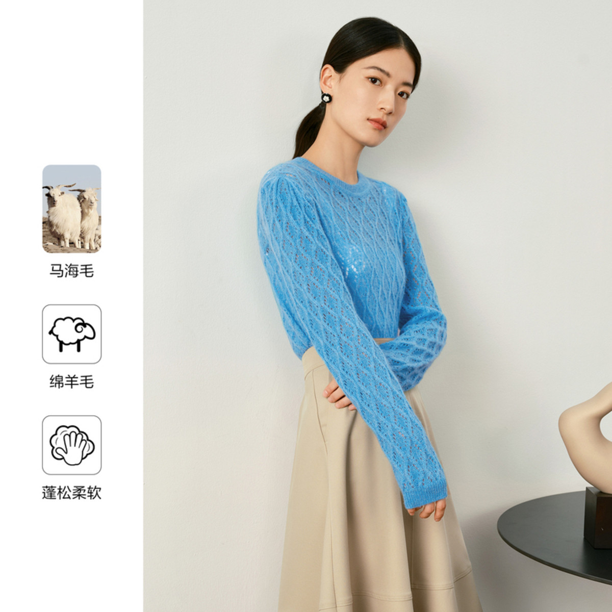 玖姿旗下安娜蔻系列圆领日常休闲镂空勾边马海毛套头毛衫女秋季 934924
