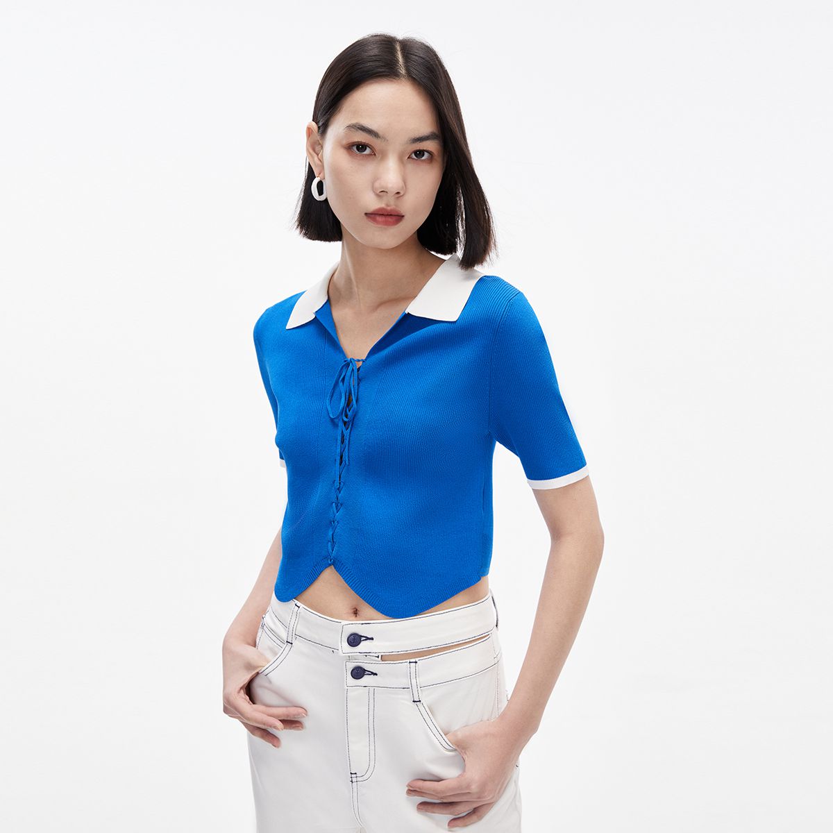 针织衫女撞色黑白短款绑带修身百搭 004561