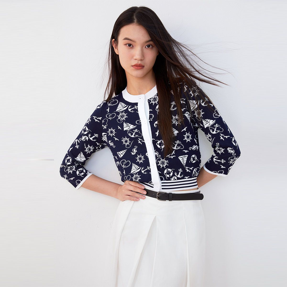 【海军风图案】春夏直筒开衫圆领七分袖针织衫女气质百搭时尚 327441