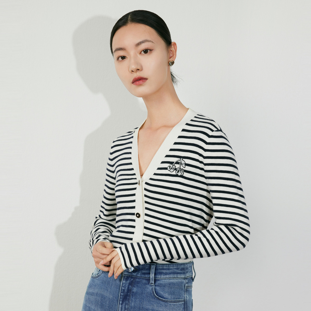 JZ玖姿条纹套头衫女装春季立体樱桃设计感长袖针织衫 030412