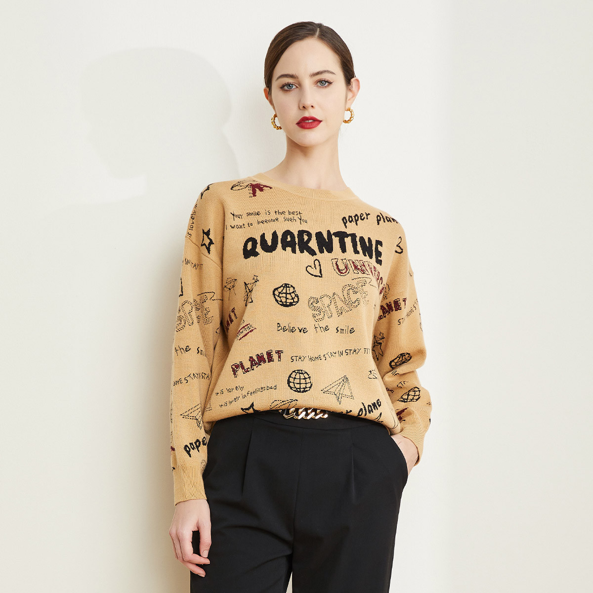 [涂鸦图案]秋季慵懒休闲风时尚减龄针织衫女上衣套头衫 026527