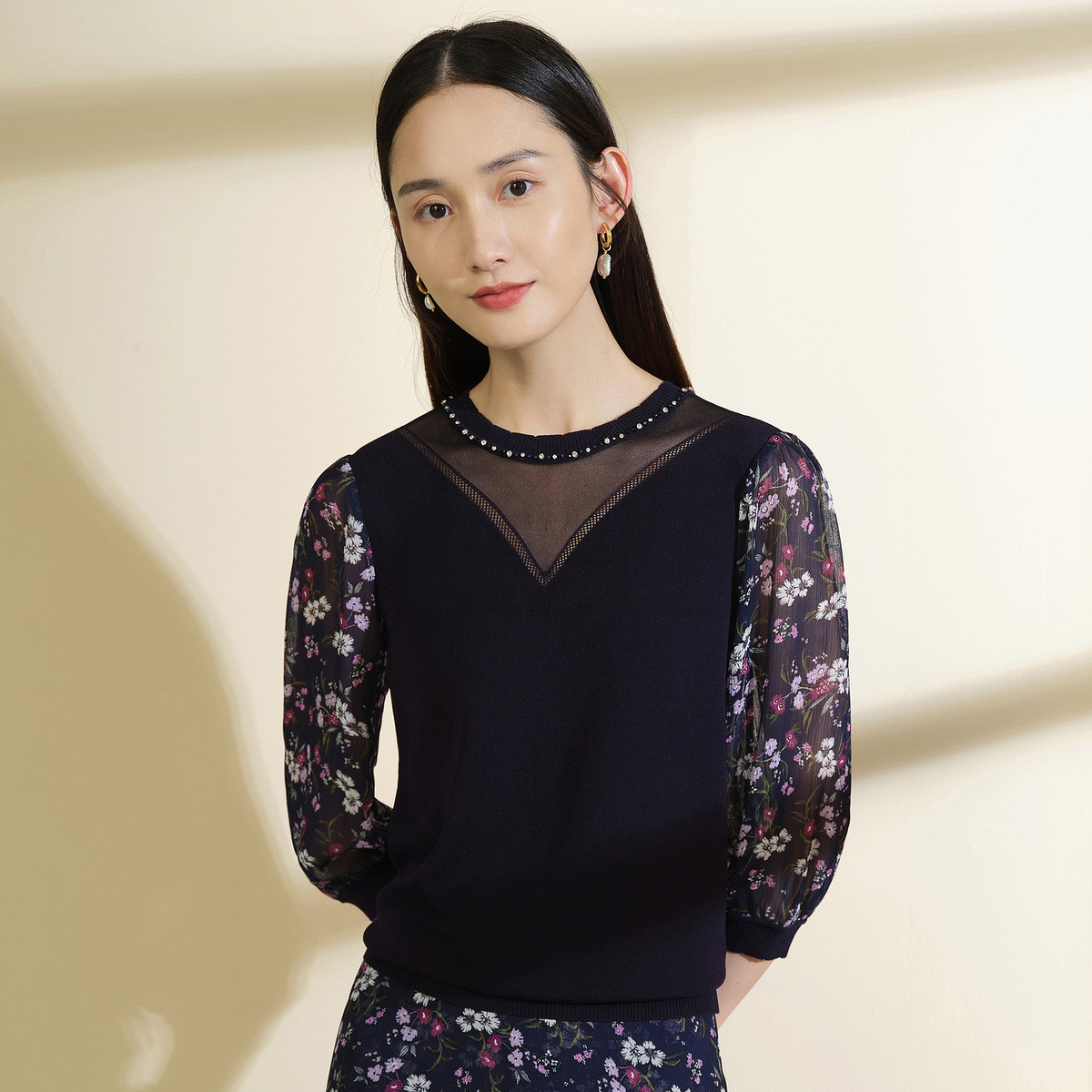 JZ玖姿商场同款时尚钉珠雪纺印花拼接针织衫JWCC31003 303244