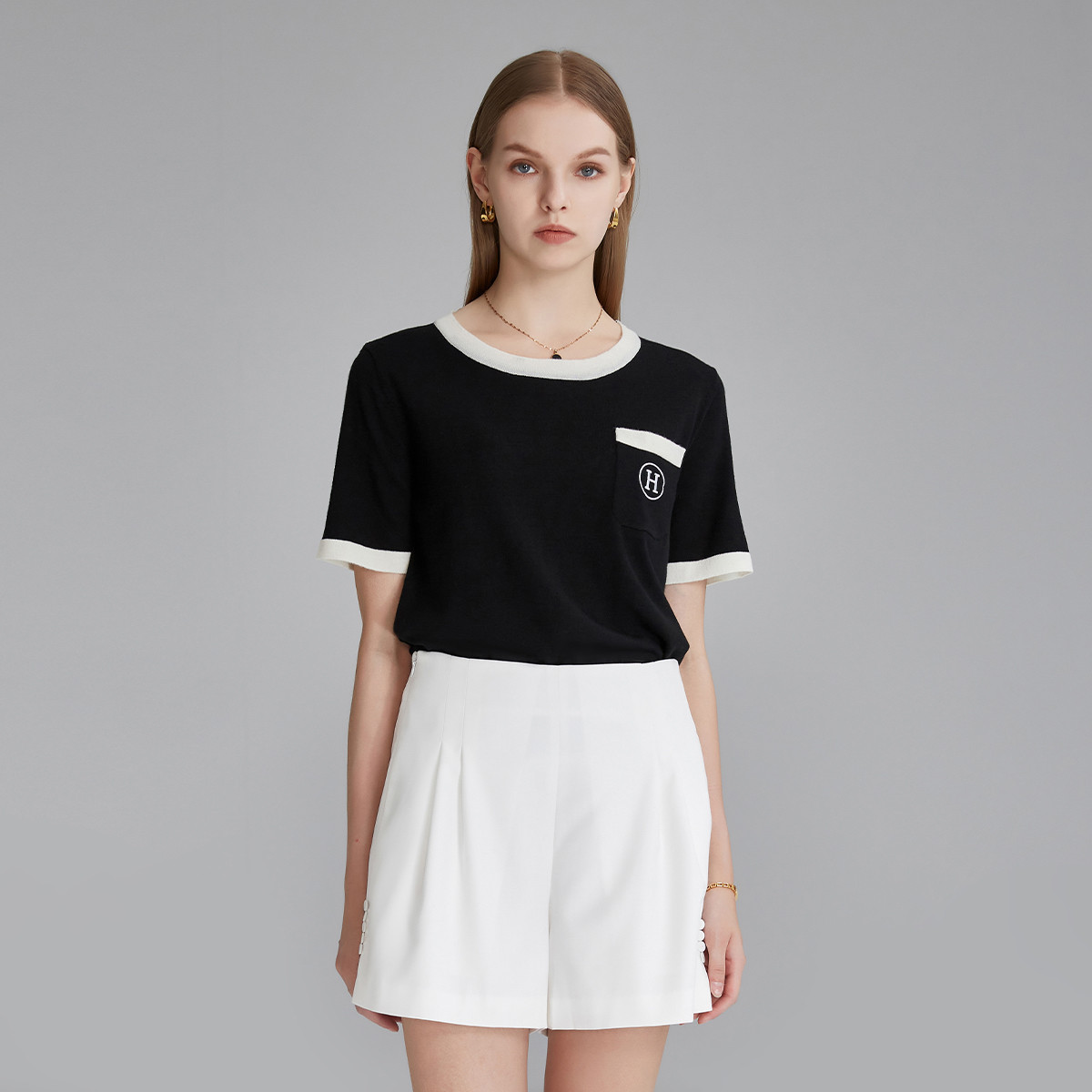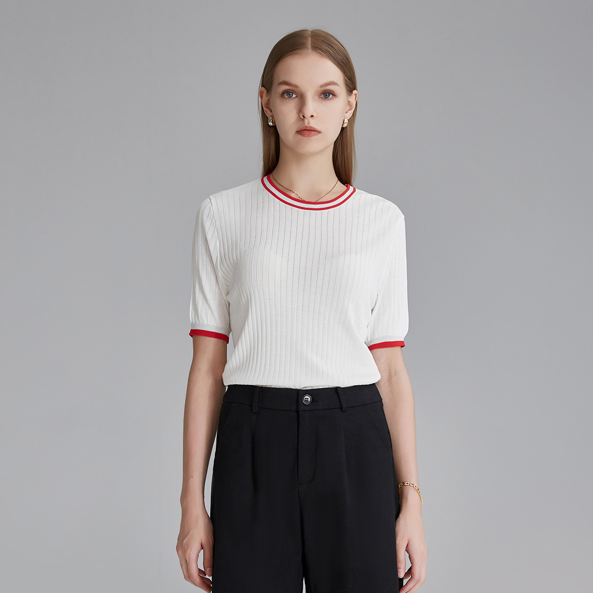 春夏新款撞色圆领针织T恤女简约时尚设计感日常休闲百搭短袖上衣 888735