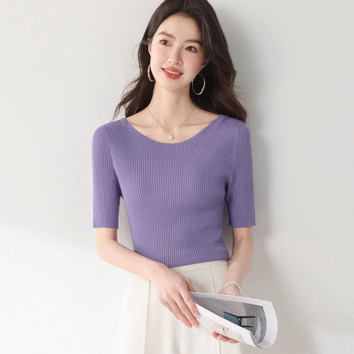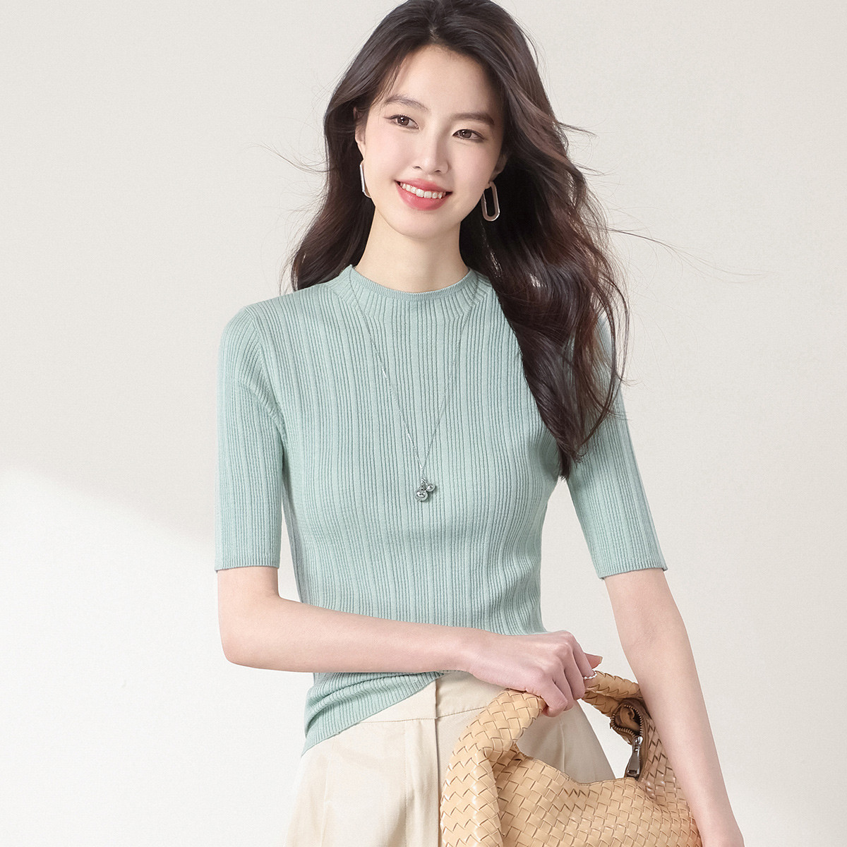 【含桑蚕丝】圆领抽条针织衫纯色简约针织五分袖T恤打底衫 253331