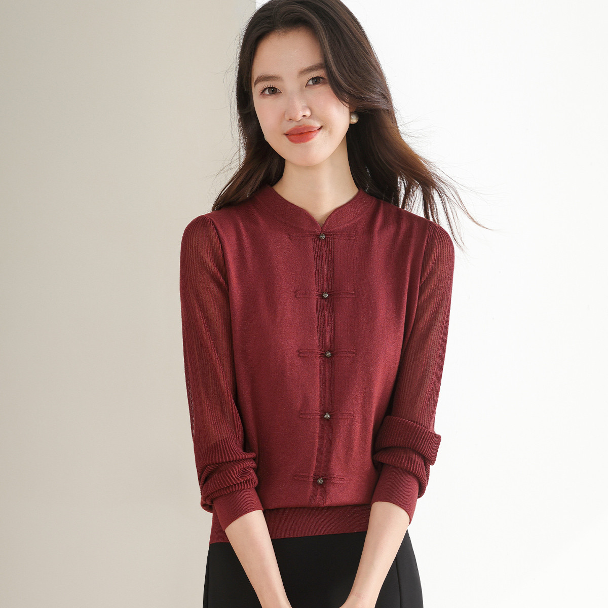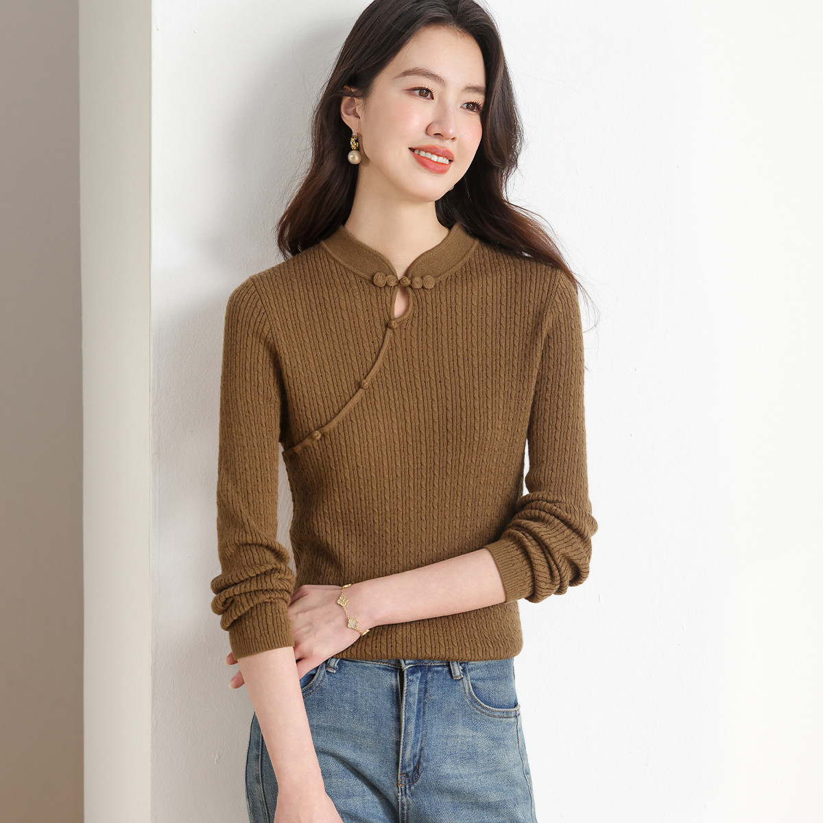 【新中式】春旗袍领针织套衫纯色含桑蚕丝打底衫线衫国风针织衫女 675795