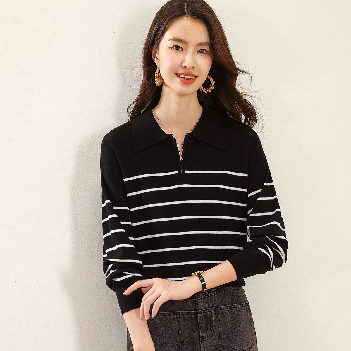 春秋款纯绵羊毛条纹小翻领拼色设计感修身套头针织衫朗姿集团 001497