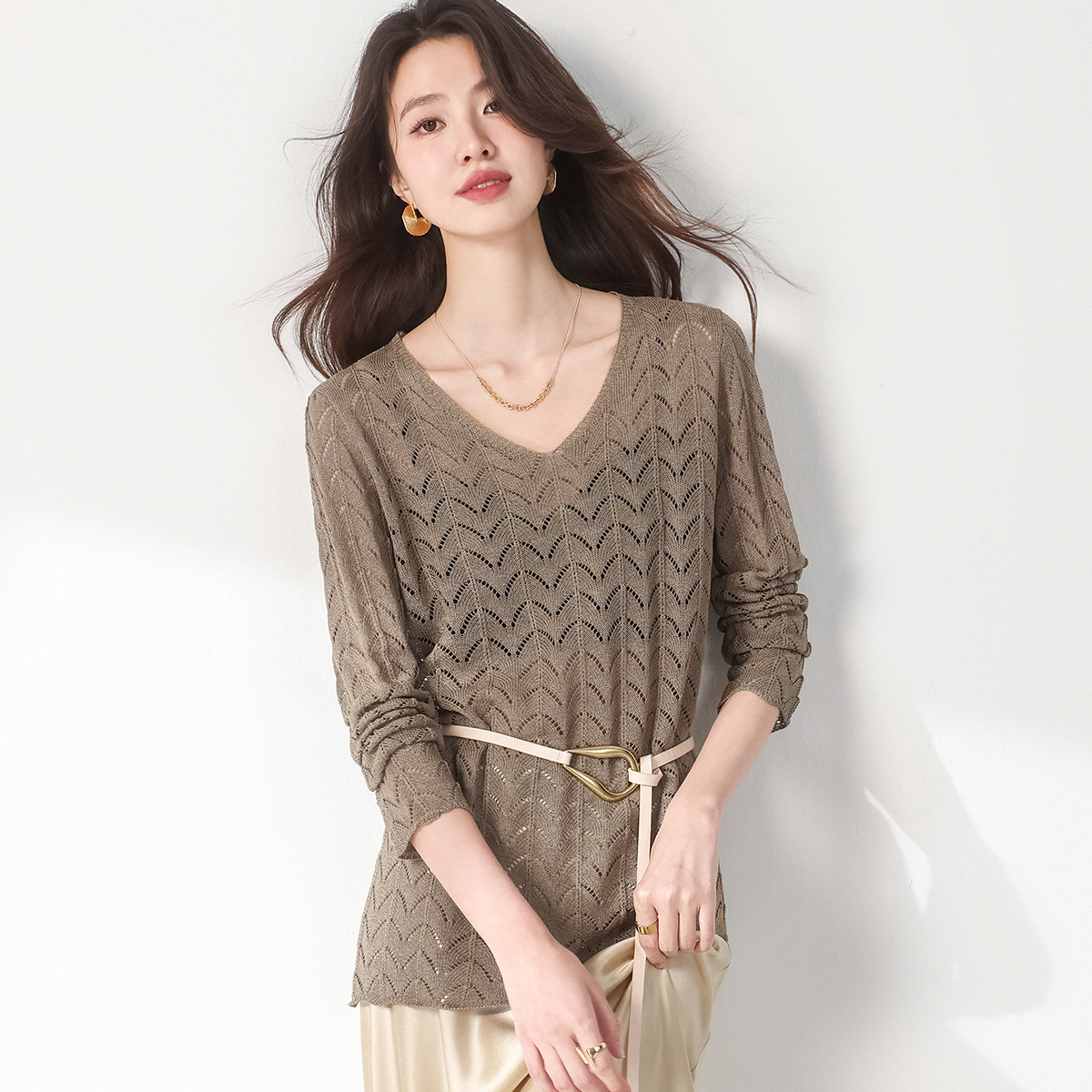 【和纸纱】圆领纯色镂空针织衫长袖夏季薄款气质含桑蚕丝打底衫 440083