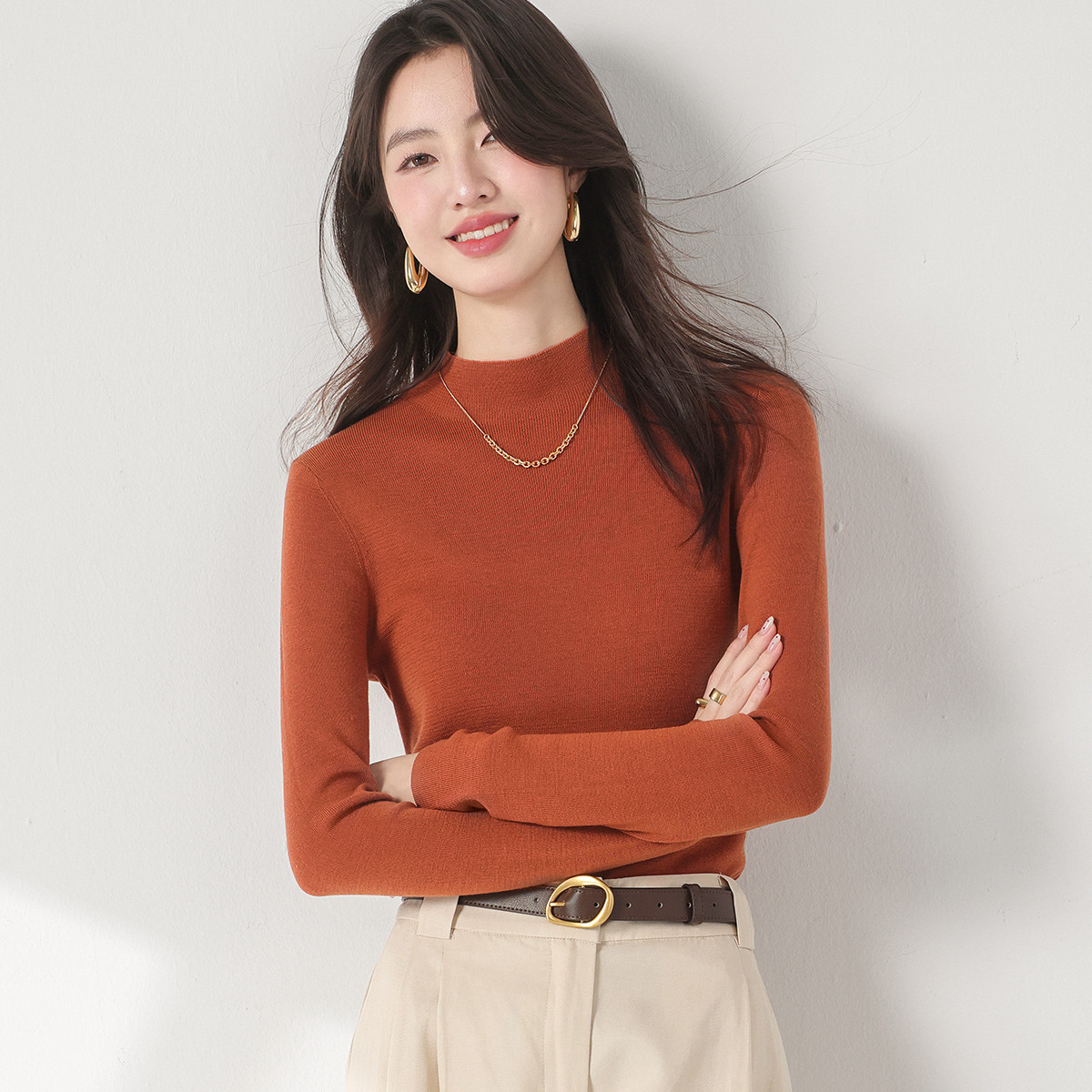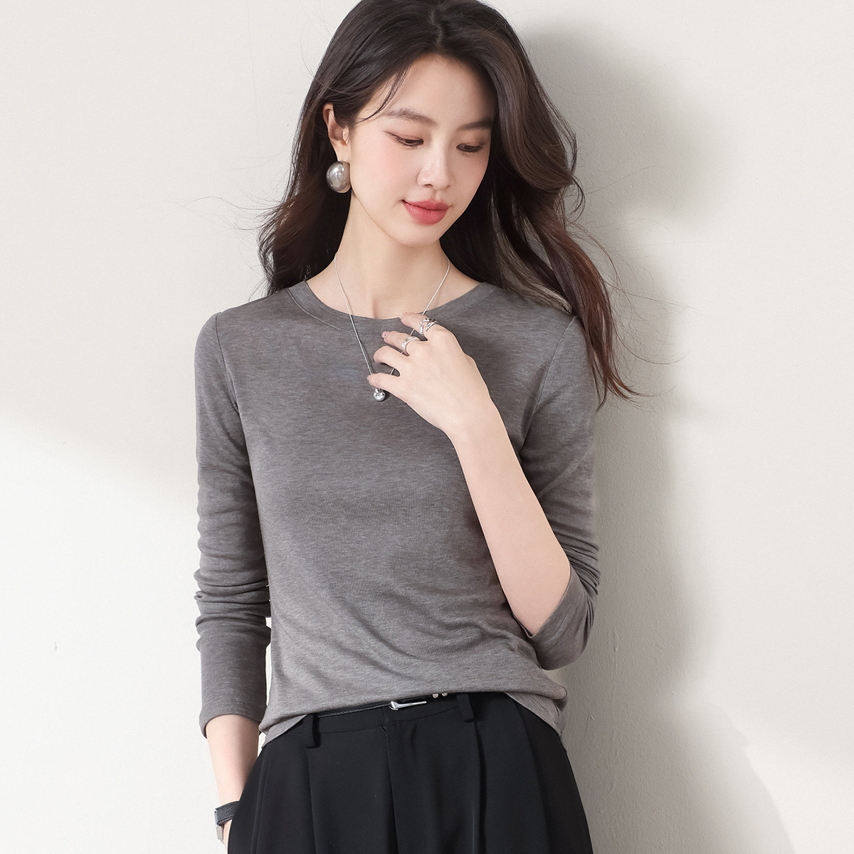 【含桑蚕丝】圆领纯色针织打底衫长袖休闲百搭针织套衫 751507