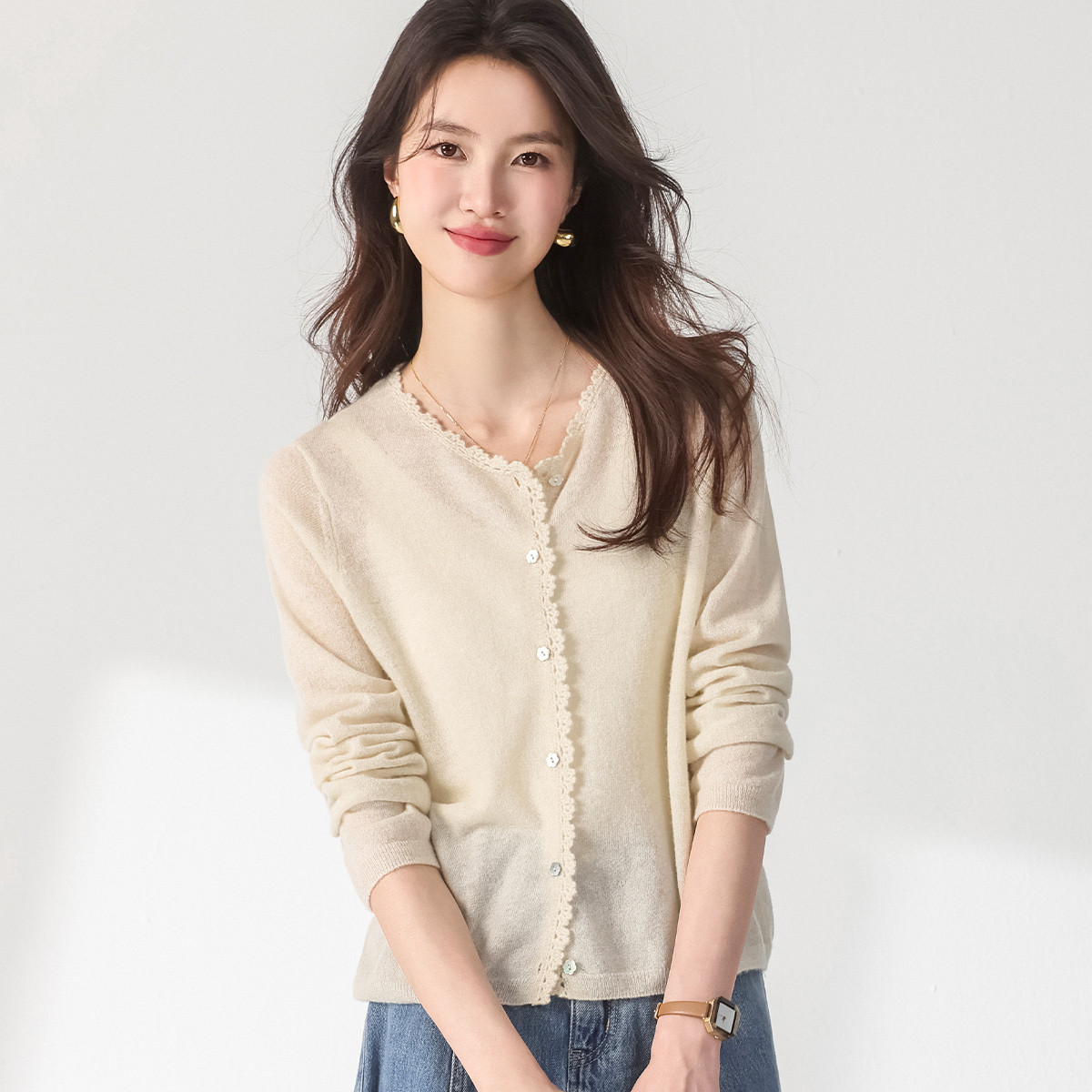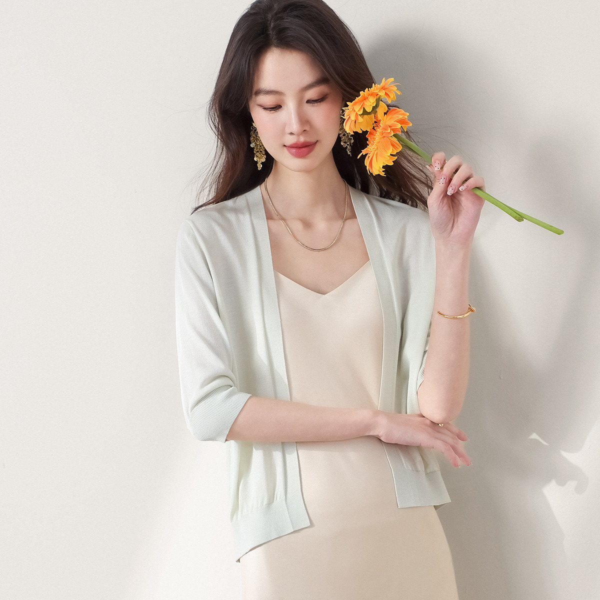 v领纯色含桑蚕丝针织开衫休闲简约针织小外套空调衫春夏薄款上衣 456595