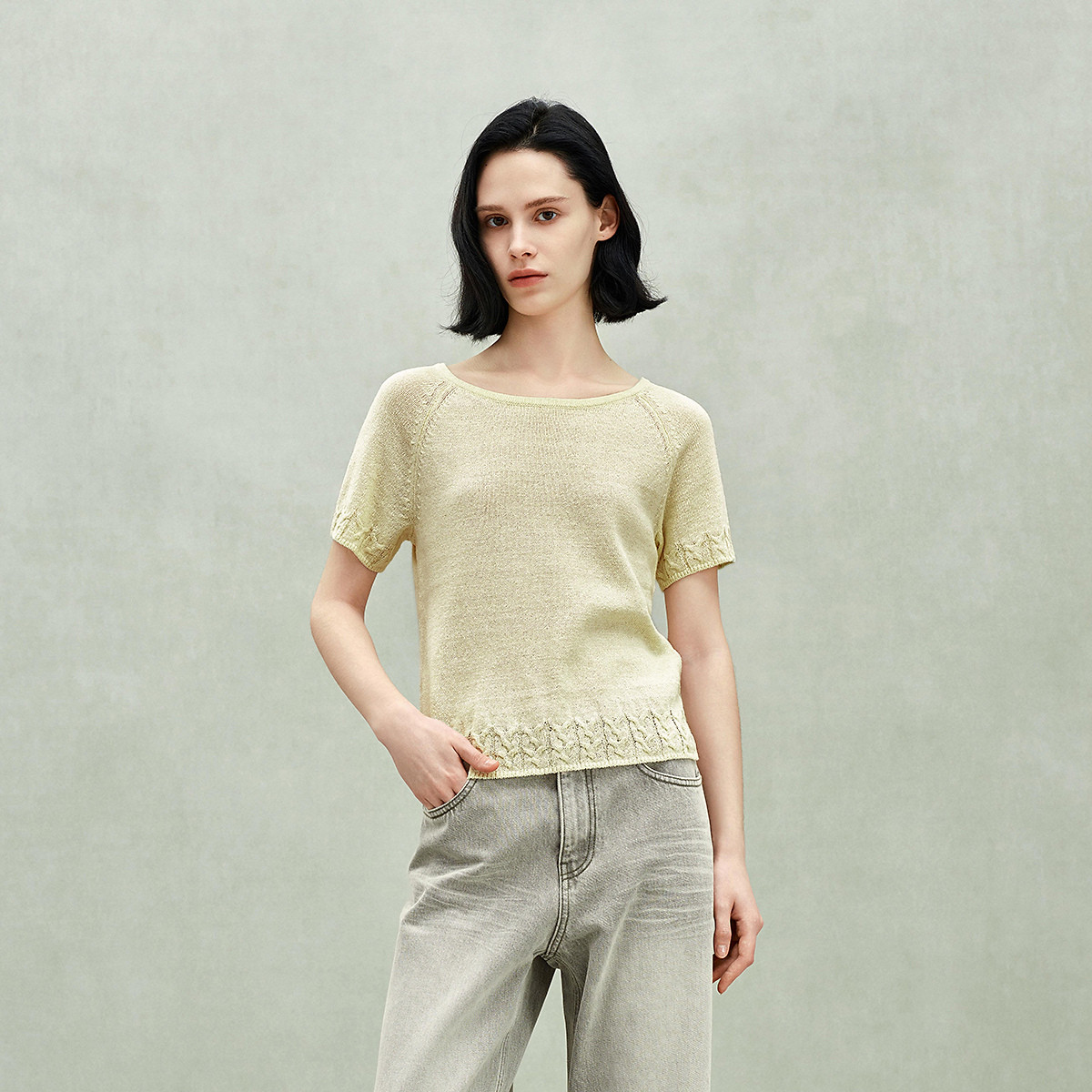 限定系列OCH.春装 亚麻混纺扭花圆领上衣短袖针织衫女 873039