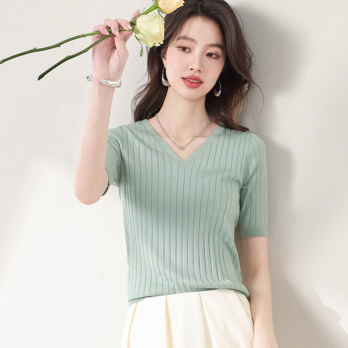 含桑蚕丝~春夏V领纯色抽条短袖针织衫女舒适气质T恤轻薄打底衫 230035